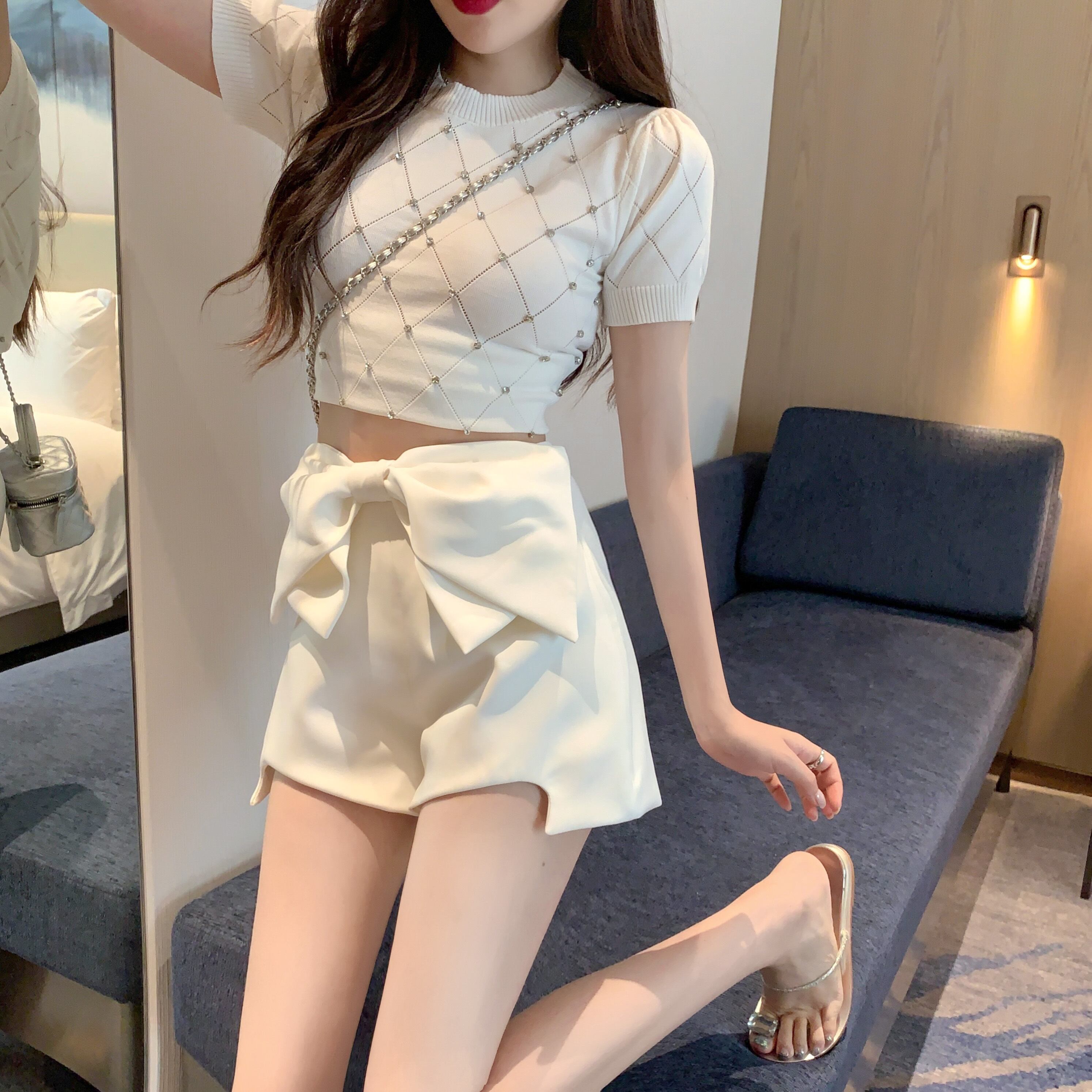 ノミクマ ちょう結び ウエスト レディース ショーツ カジュアル イレギュラー ワイドレッグ ショート 夏 ボトムス リボン サマー 夏物 ブルマー ワイドパンツ