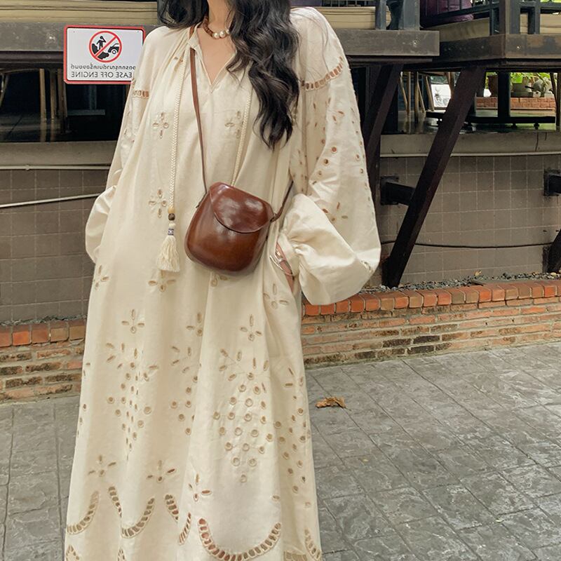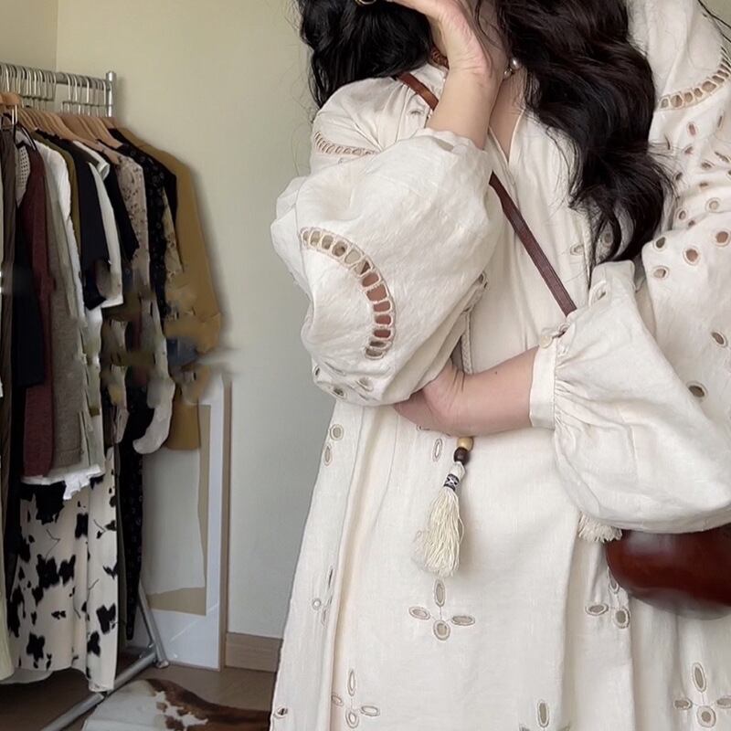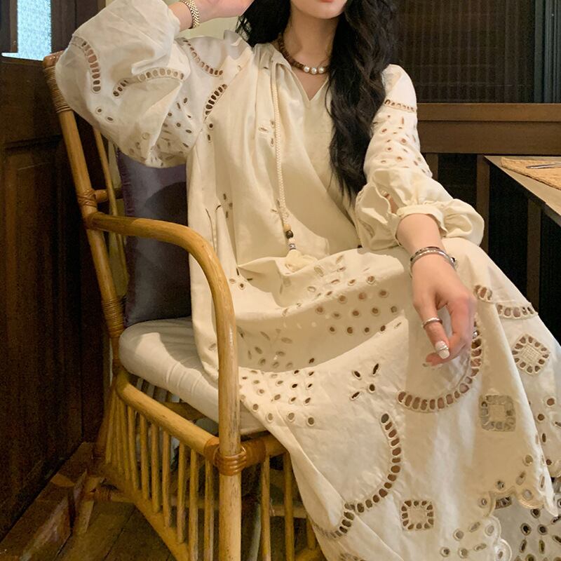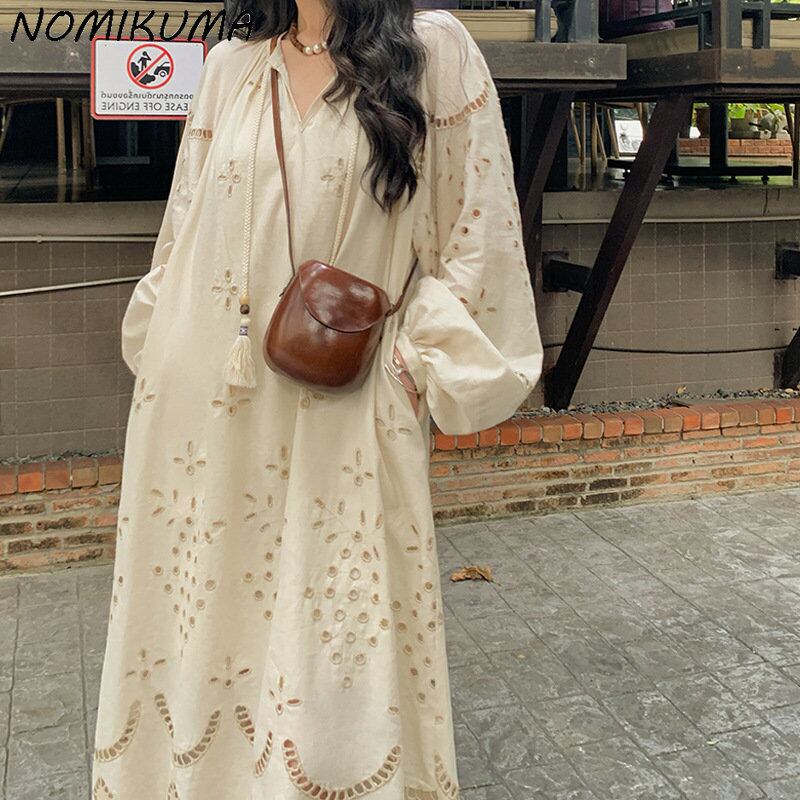 Nomikuma シック中空アウト刺繍ドレス電話レースアップ V ネックランタンスリーブドレス因果 Vestidos Vネック