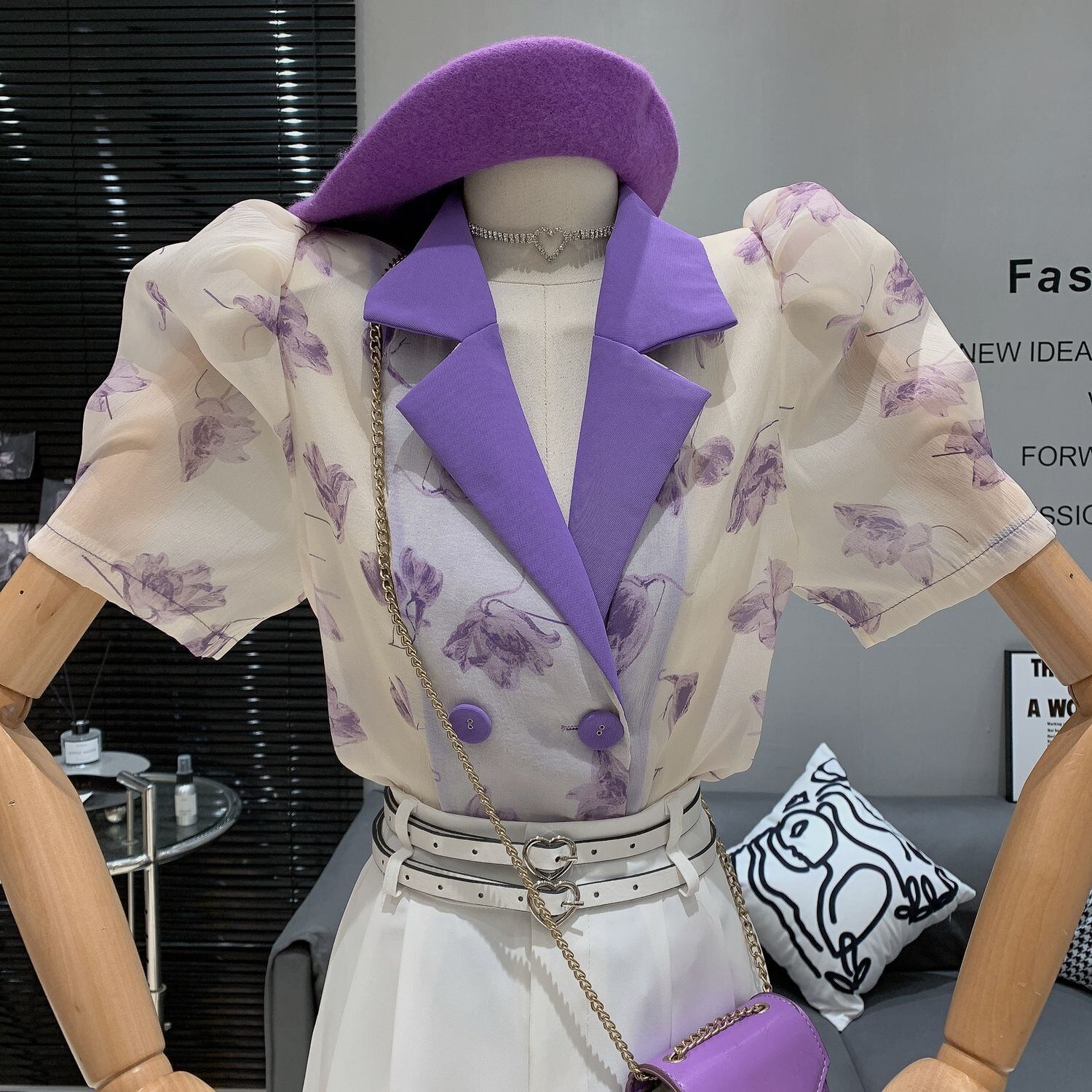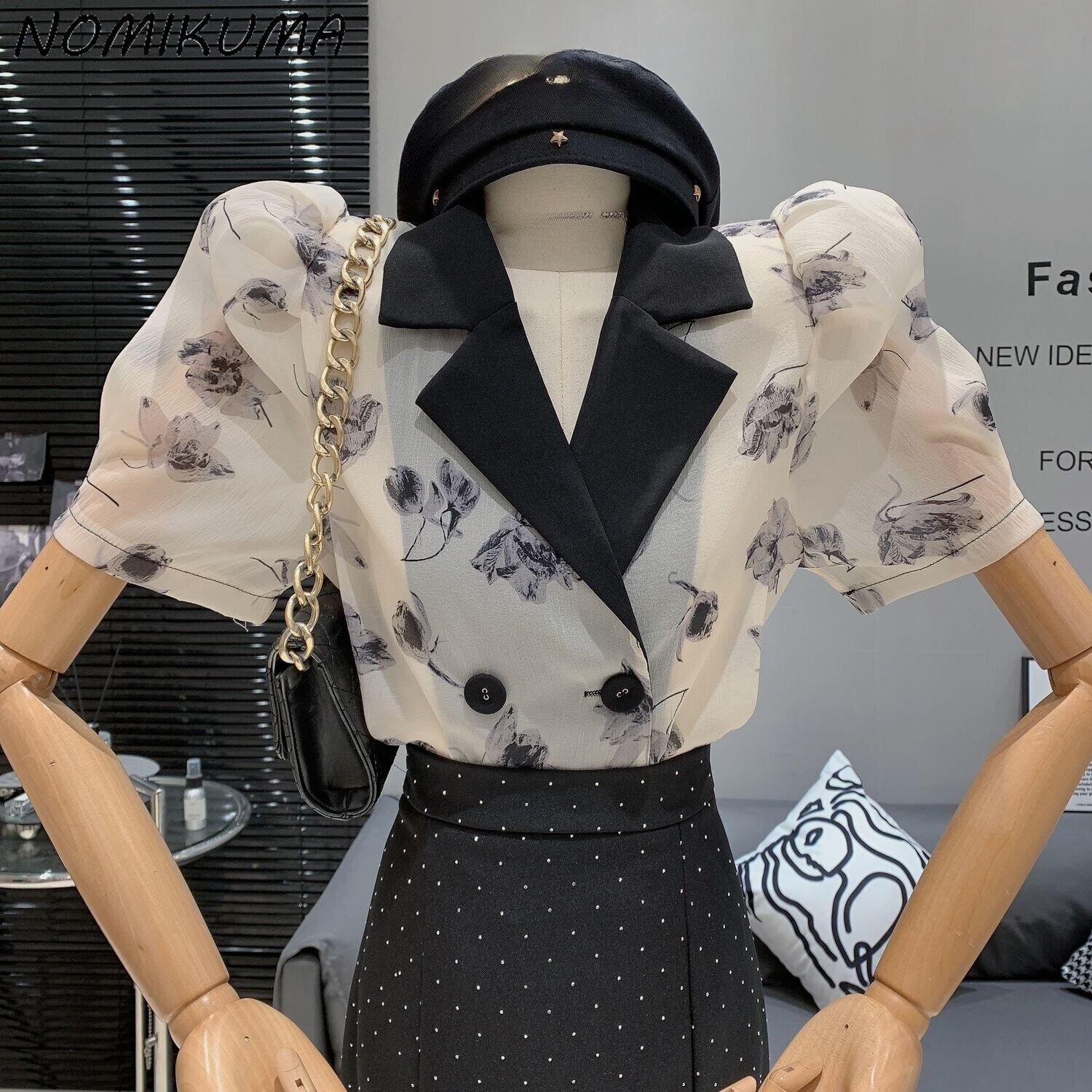 Nomikuma フローラル パフスリーブ ノッチド カラー ブラウス レディース Sumemr ダブルブレスト シャツ 花柄