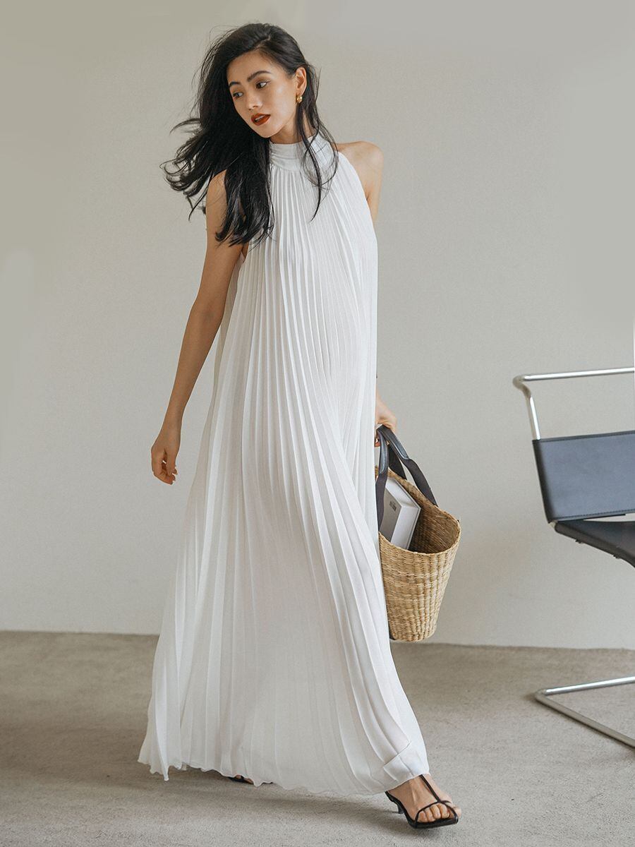 Nomikuma 夏ノースリーブ ホルター プリーツ ドレス因果 A ライン ドレスロング Vestidos デ サマー 夏物 Aライン ソリッドカラー