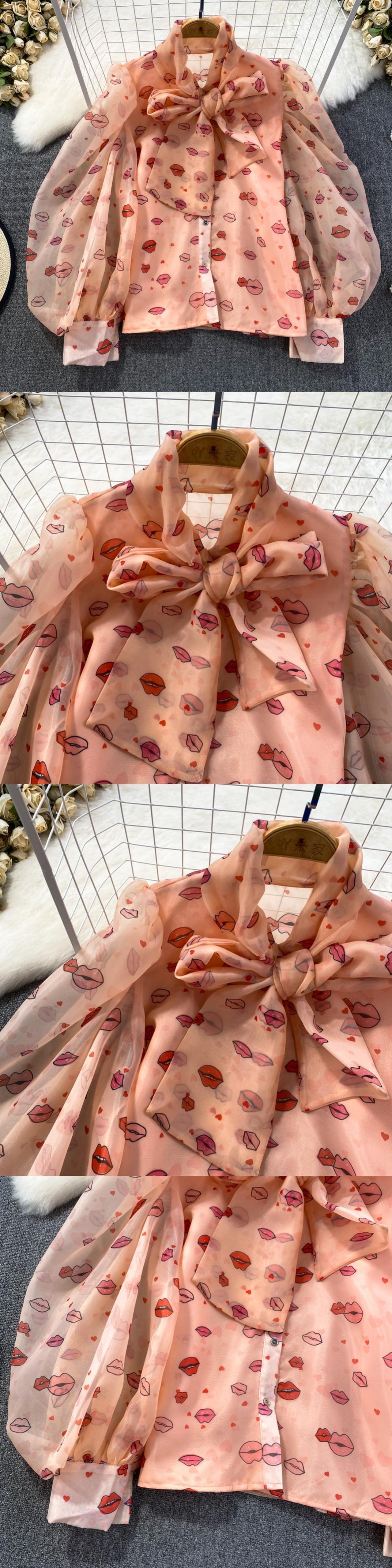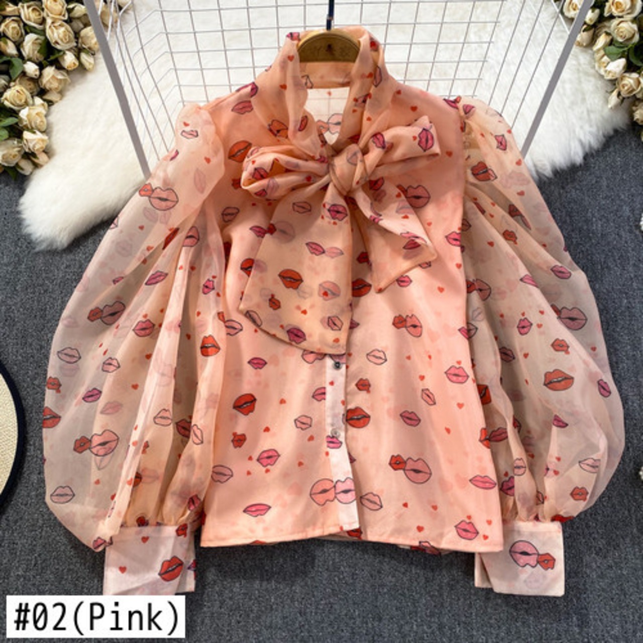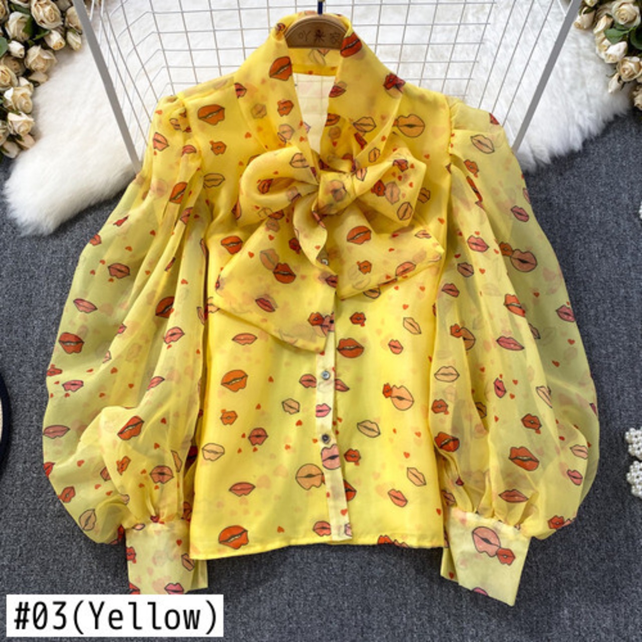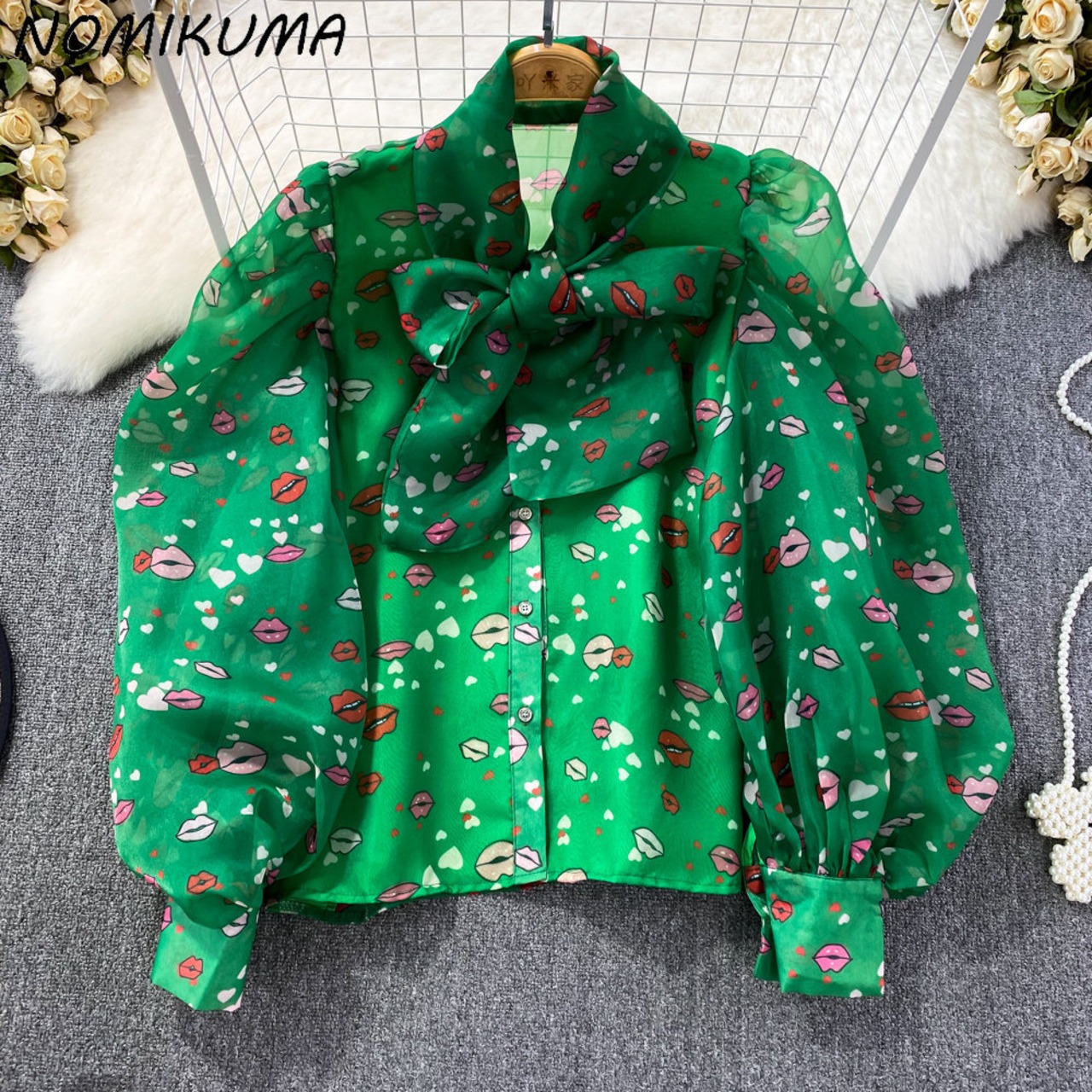 Nomikuma 甘い弓包帯ランタンスリーブプリントブラウストップスシックシャツデ リボン 大人ガーリー スウィート キュート カジュアル