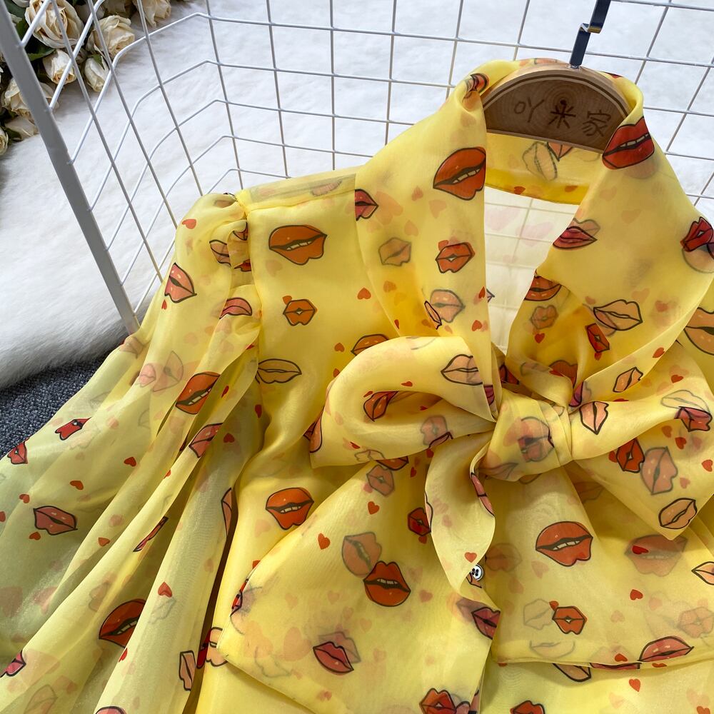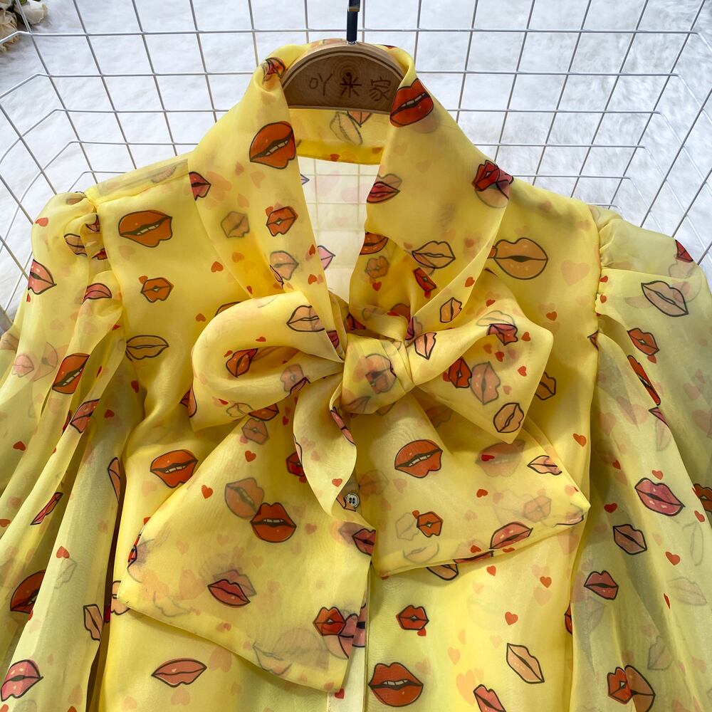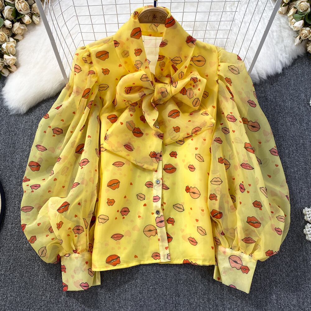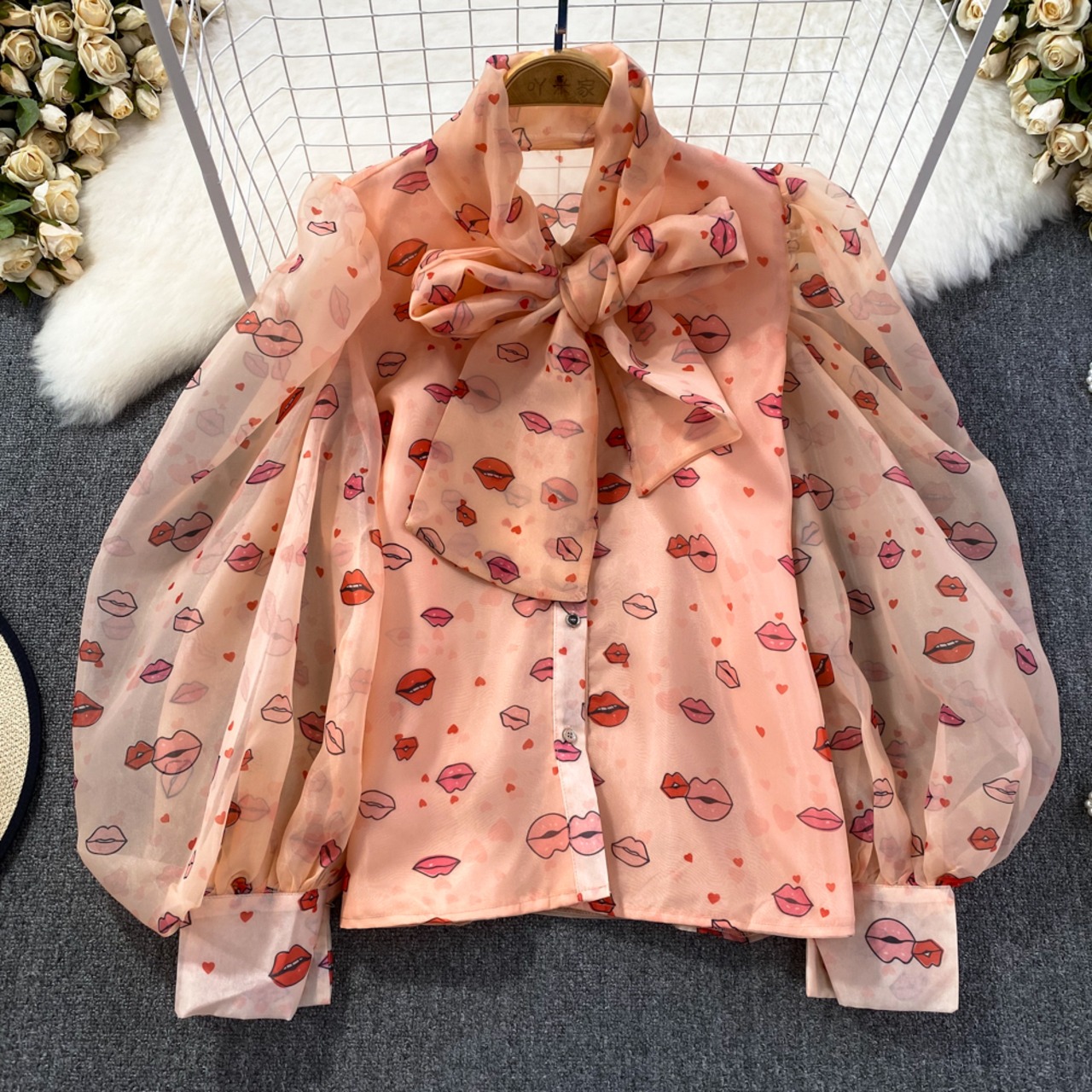Nomikuma 甘い弓包帯ランタンスリーブプリントブラウストップスシックシャツデ リボン 大人ガーリー スウィート キュート カジュアル