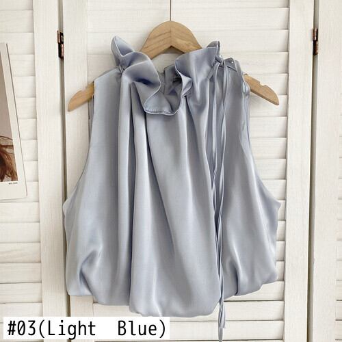 Nomikuma シックフリルスタンドネック包帯ノースリーブサテンベストトップス因果無地夏タンク サマー 夏物 ソリッドカラー