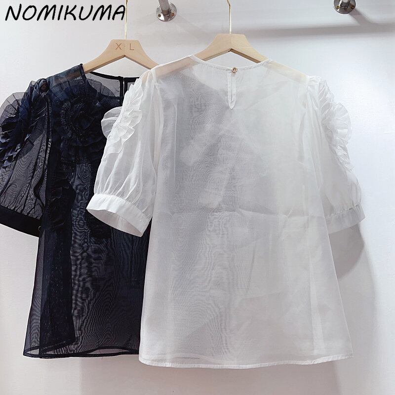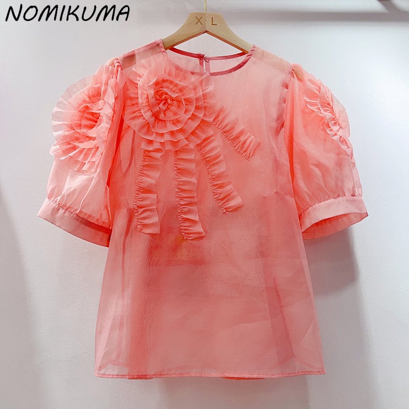 Nomikuma シック 3D 花パッチワークシャツ甘いパフスリーブ O ネックトップス因果夏プルオーバー Tシャツ 大人ガーリー スウィート キュート カジュアル サマー 夏物 Oネック フラワーデザイン