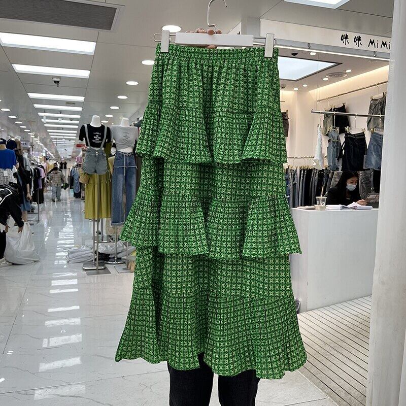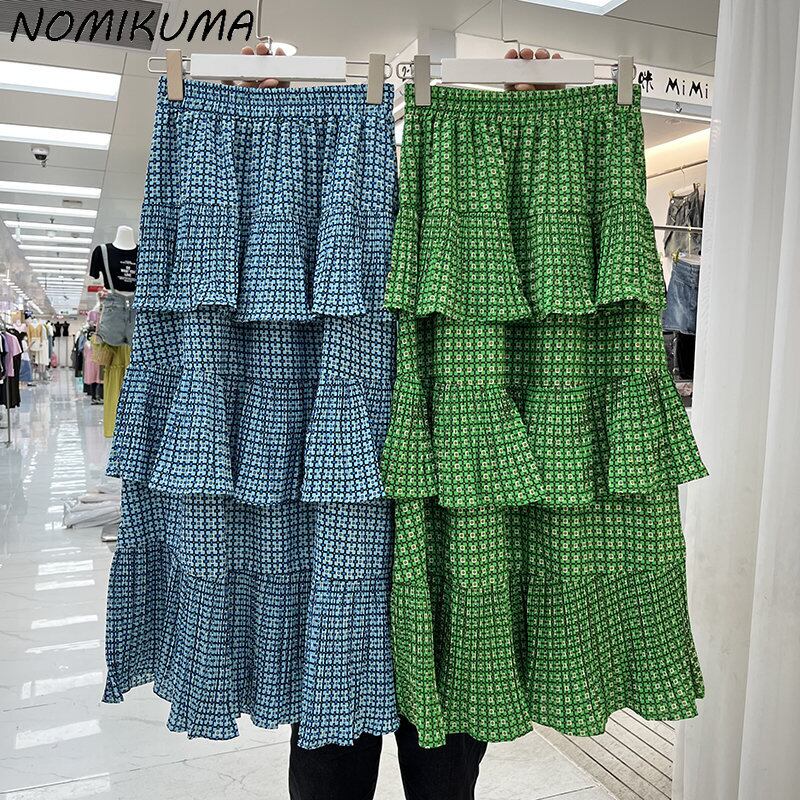 Nomikuma チェック柄フリル パッチワーク A ライン スカート レディース弾性ウエスト スカート夏カジュアル A ライン ボトムス エラスティック 伸縮 サマー 夏物 Aライン