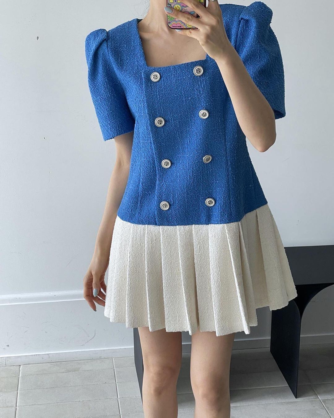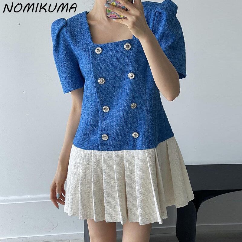 Nomikuma ダブルブレストコントラストカラードレススクエアカラーパフスリーブ Vestidos プリーツドレス スクウェア