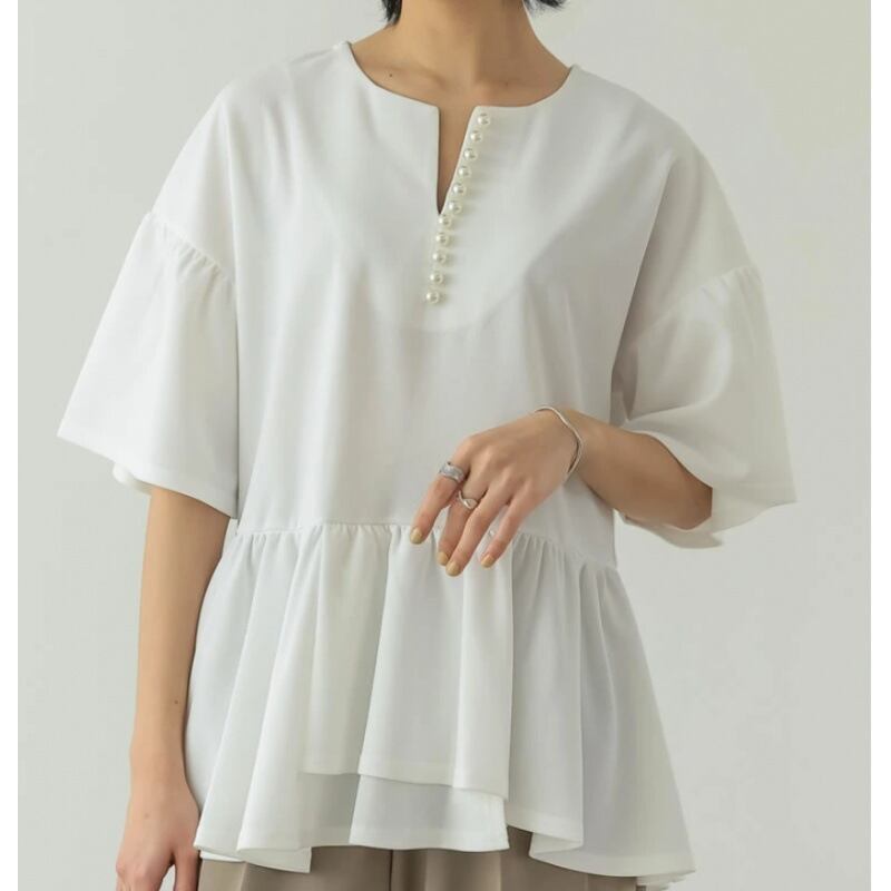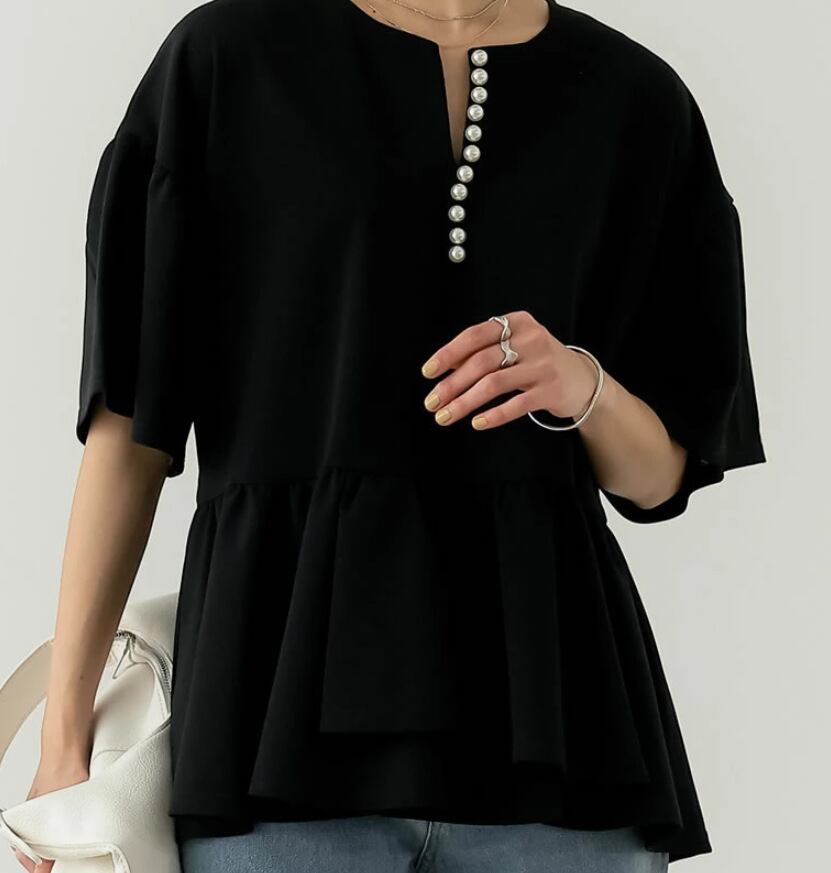 Nomikuma 夏スタイル ビーズ V ネック ドール シャツ スウィート フリル パッチワーク 半袖 プルオーバー トップス シャツ ショート ハーフスリーブ 大人ガーリー キュート カジュアル サマー 夏物 Vネック