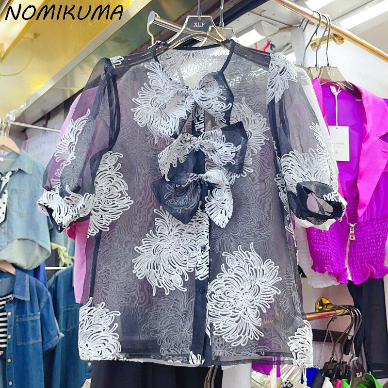 ノミクマ ヒットコロ 刺繍 甘い 立体 ちょう結び パフスリーブ ブラウス シャツ 夏 シースルー メッシュ トップス リボン 大人ガーリー スウィート キュート カジュアル サマー 夏物