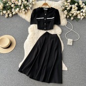 Nomikuma 夏セットシックパフスリーブ O ネックショートブラウストップ + ウエスト因果 A ラインスカート 2 ピース サマー 夏物 Oネック Aライン