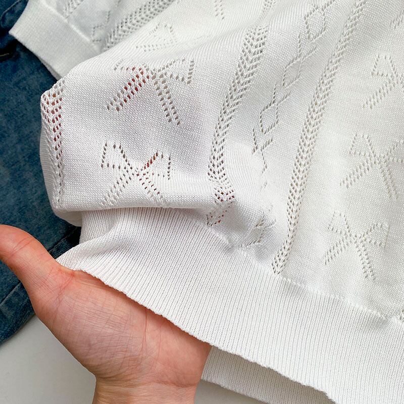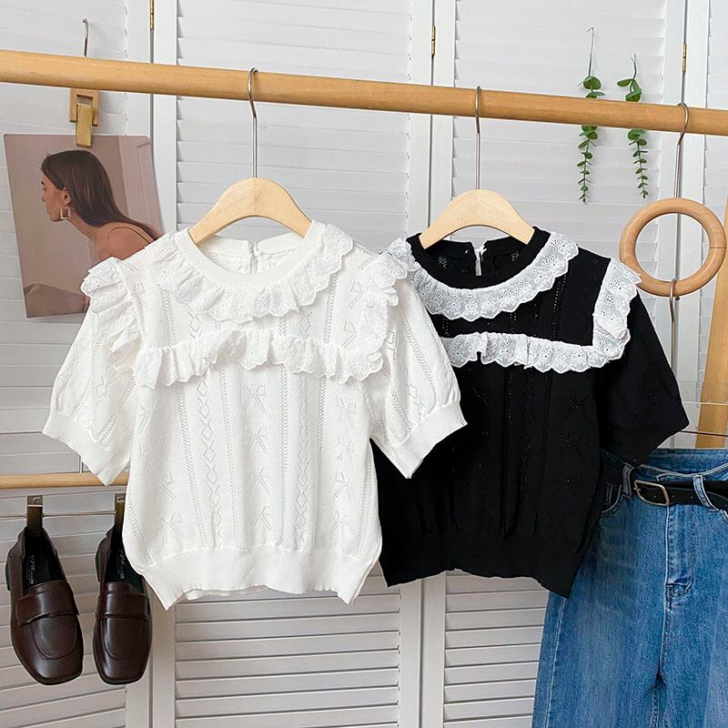 ノミクマ シック ホック フリル Oネック プルオーバー ニット カジュアル 春夏 パフスリーブ ショートニット セーター スプリング 春物 サマー 夏物