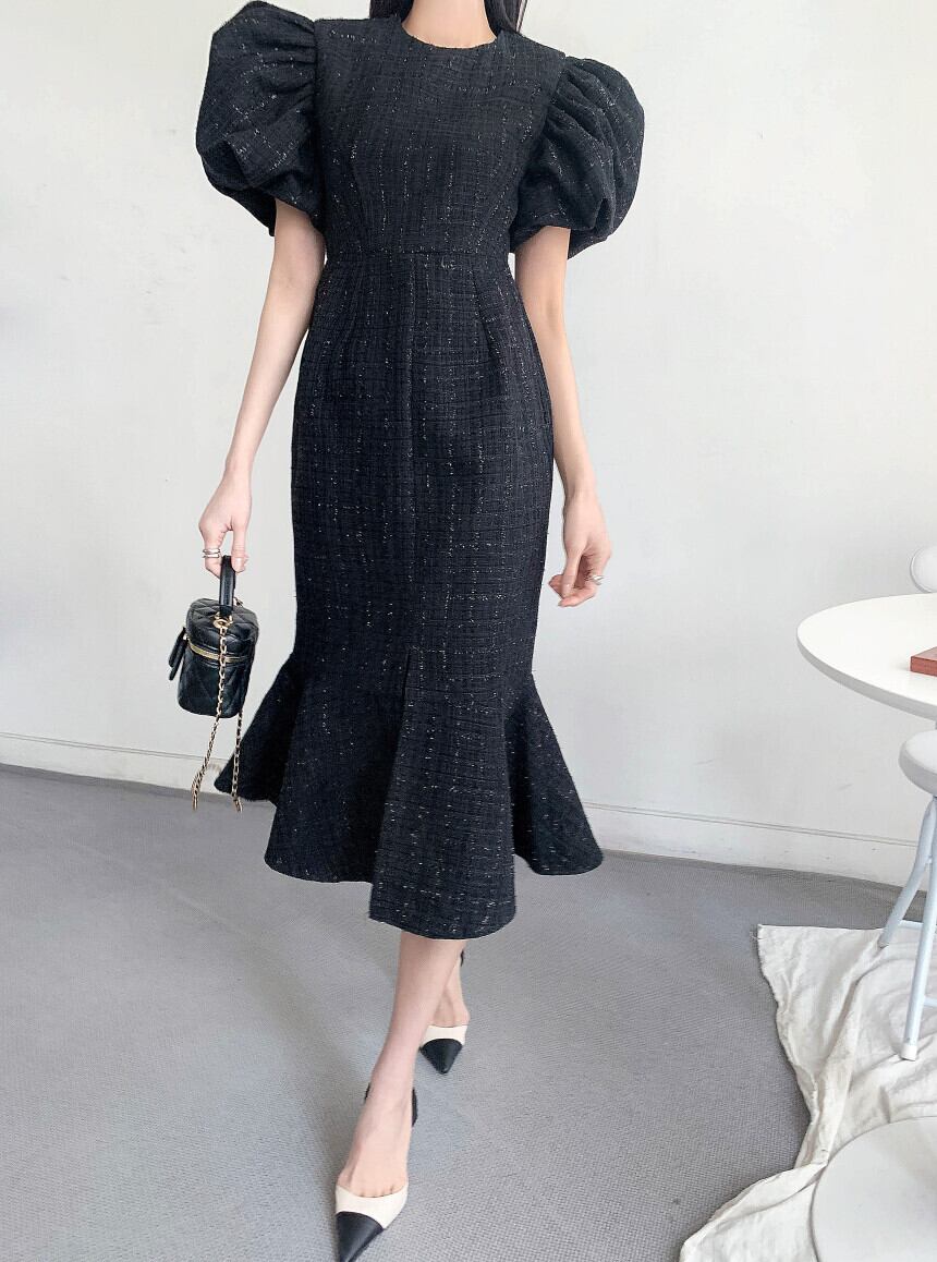 Nomikuma スプリットマーメイドドレスシック夏パフスリーブ O ネックドレススリムウエストトランペット Vestidos サマー 夏物 Oネック