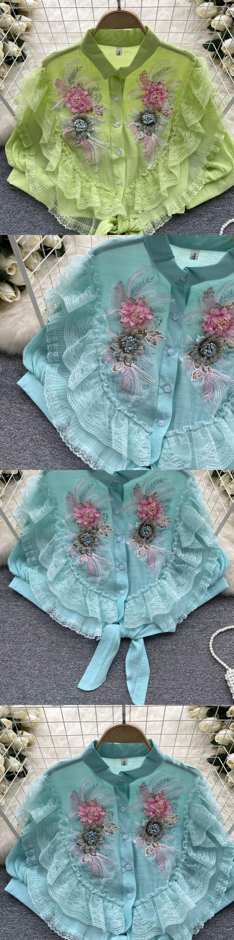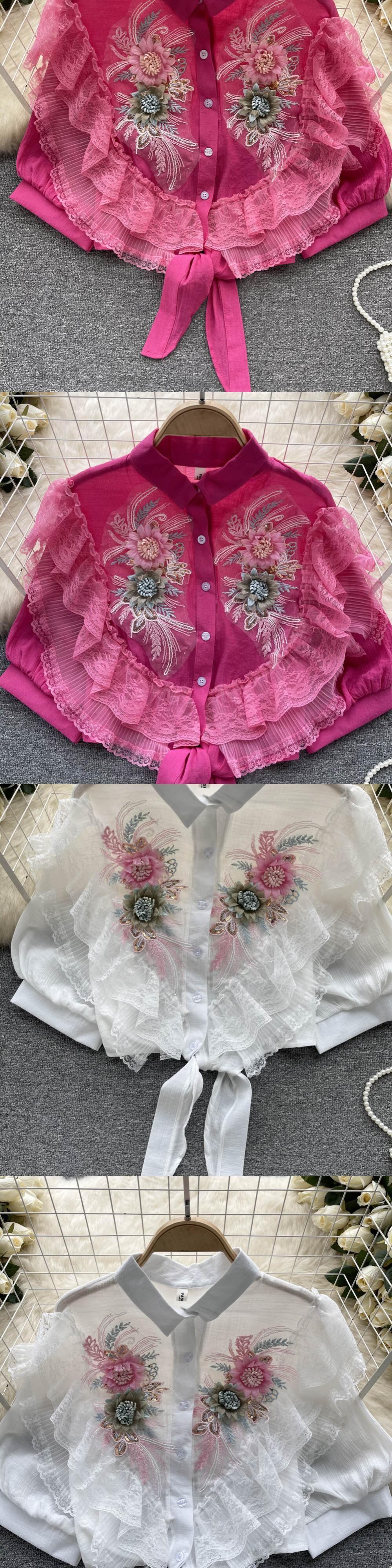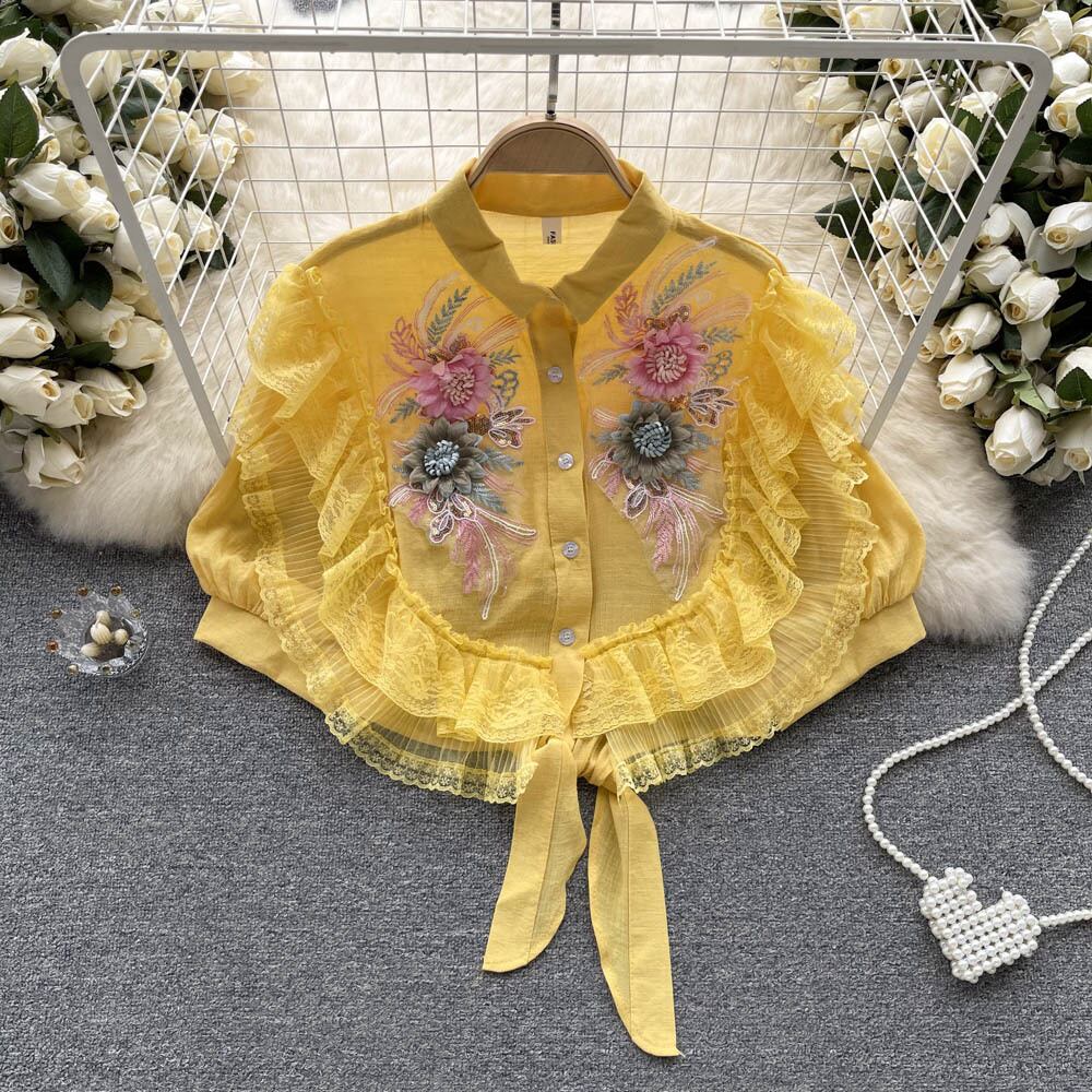 Nomikuma シック刺繍ブラウス夏レースメッシュ 3D 花包帯ショートシャツ甘い 大人ガーリー スウィート キュート カジュアル サマー 夏物 フラワーデザイン