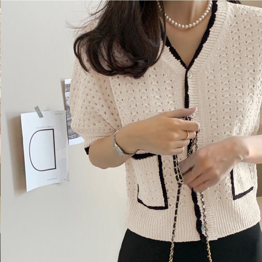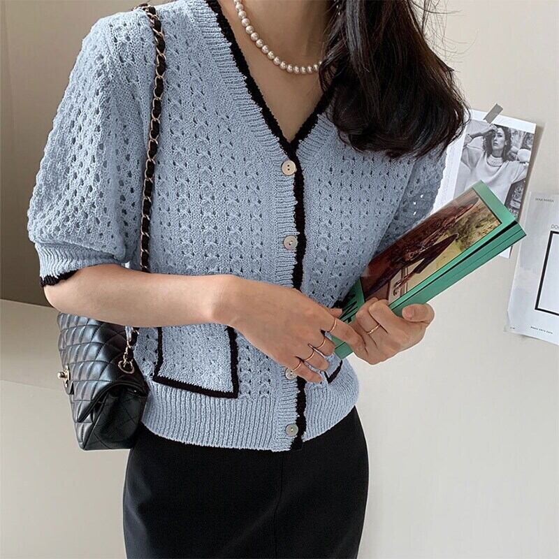 ノミクマシック夏Vネックヒットカラーセーターコートパフスリーブシングルブレストニットカーディガントップス サマー 夏物