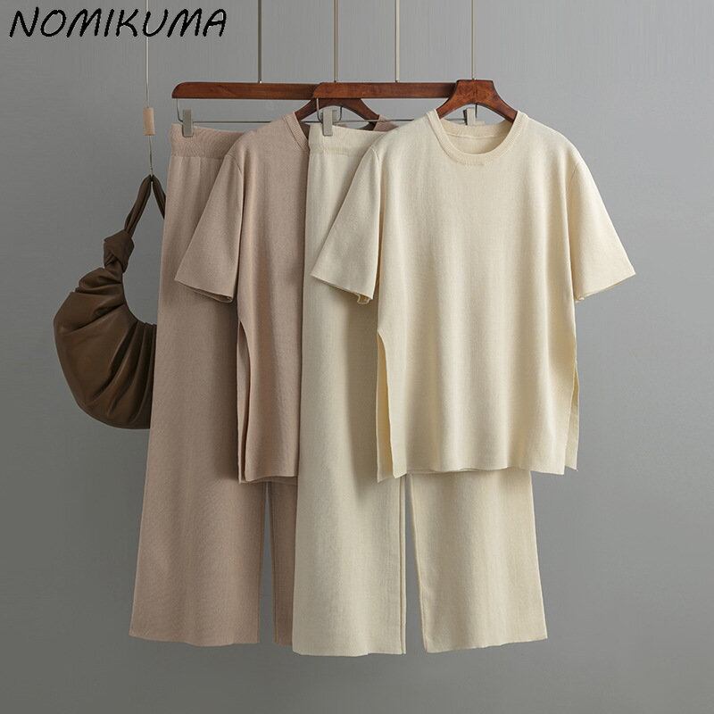 Nomikuma ニットセット レディース 因果 無地 半袖 プルオーバー ニット + レースアップ ウエスト ワイドレッグ セーター ロングパンツ ショート ハーフスリーブ ワイドパンツ ソリッドカラー