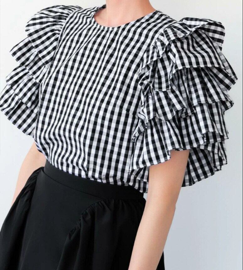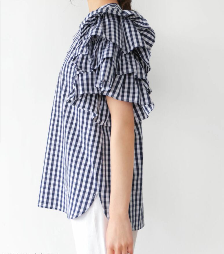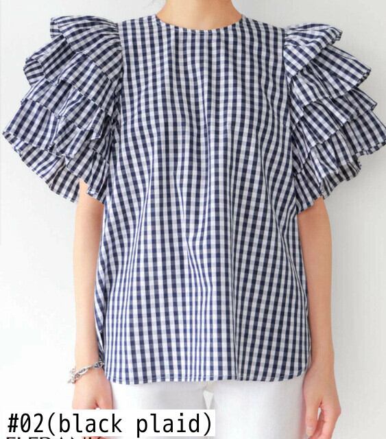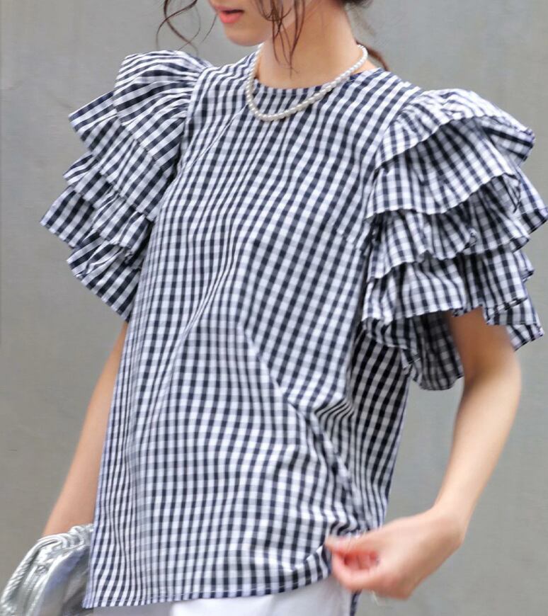 Nomikuma 夏スタイルチェック柄レディーストップスシックフリルパッチワーク半袖 O ネックシャツ因果甘いプルオーバー ショート ハーフスリーブ 大人ガーリー スウィート キュート カジュアル サマー 夏物 Oネック