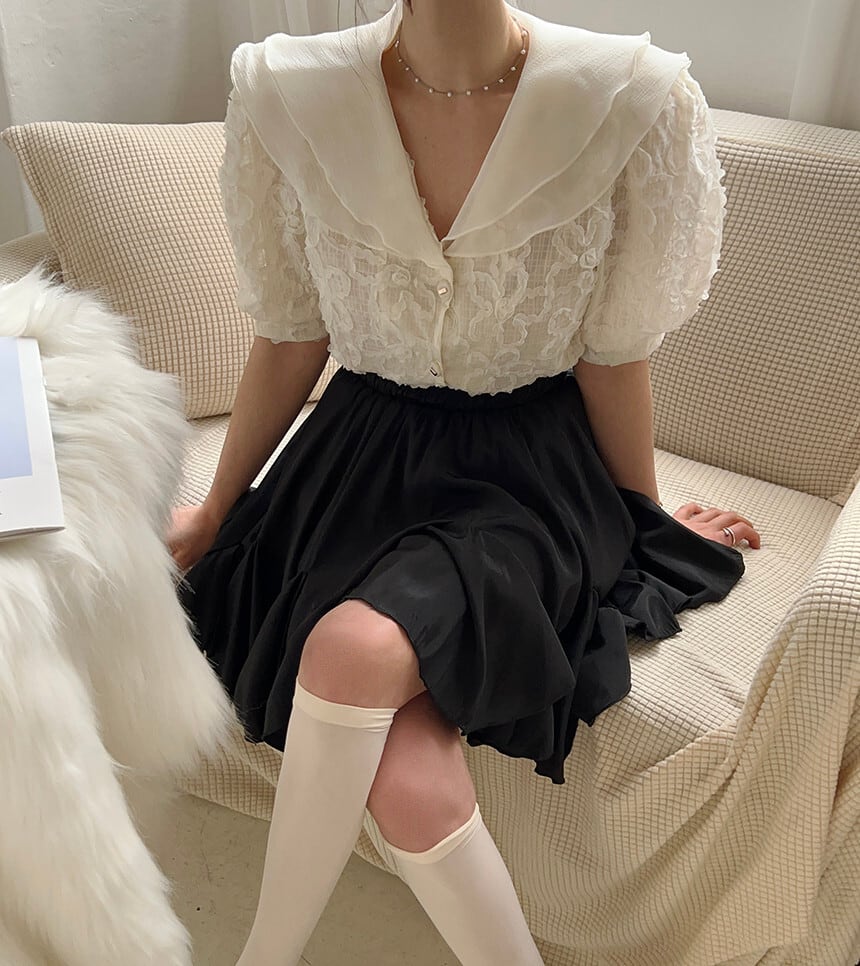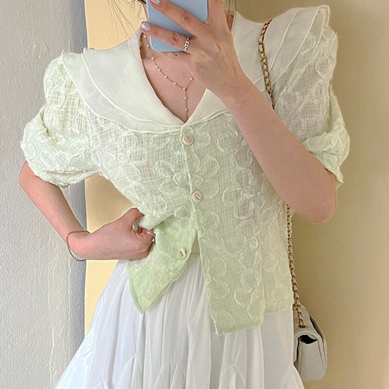 Nomikuma シック夏 3D 花ブラウス シャツ甘いフリル ターンダウン襟パフ スリーブ レディース トップス カミーサ 大人ガーリー スウィート キュート カジュアル サマー 夏物 フラワーデザイン