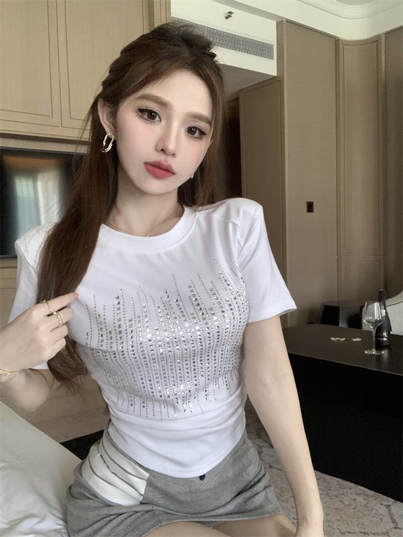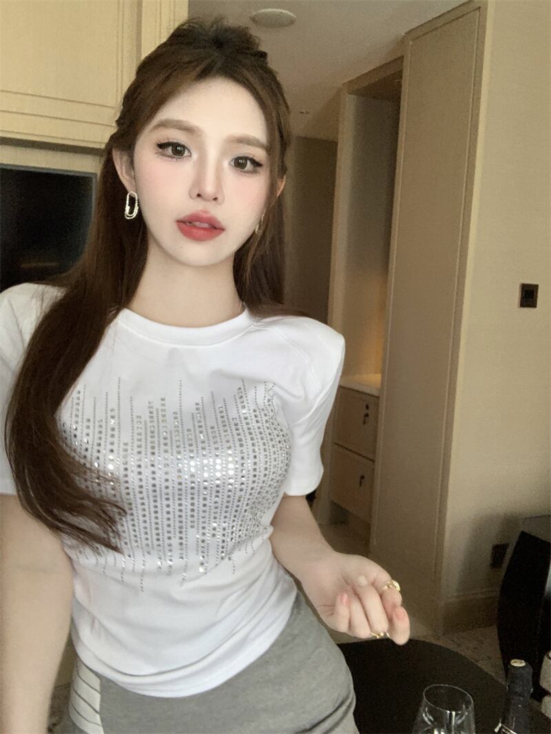 Nomikuma ラウンドネックダイヤモンド半袖TシャツレディースサマーガールスリムショルダーパッドショートTシャツトップス ハーフスリーブ 夏物 Oネック