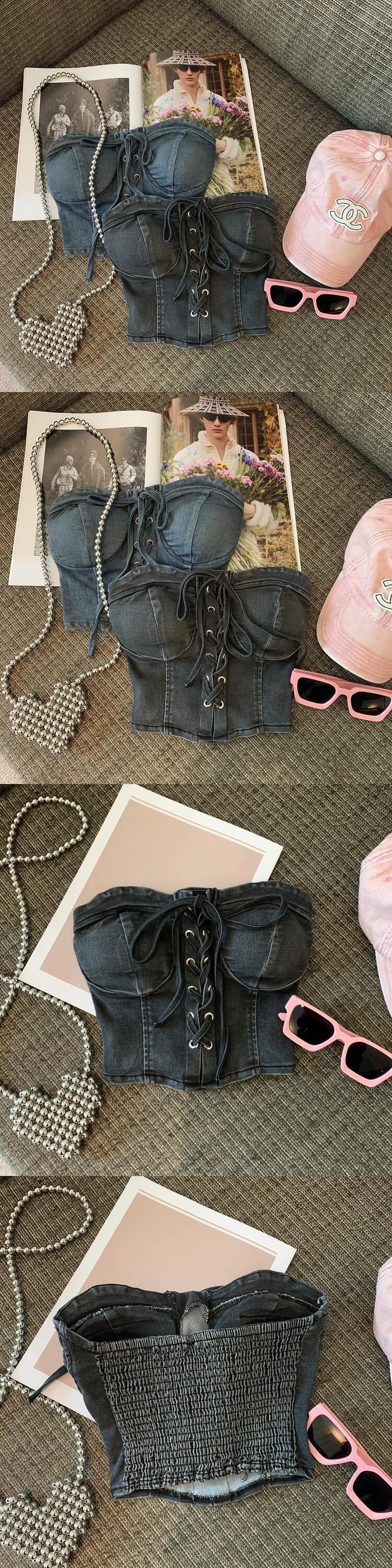 Nomikuma レースアップ 巾着 Demin タンクトップ 夏 セクシー オフショルダー ストラップレス スリム ノースリーブ ベスト Y2k トップ サマー 夏物