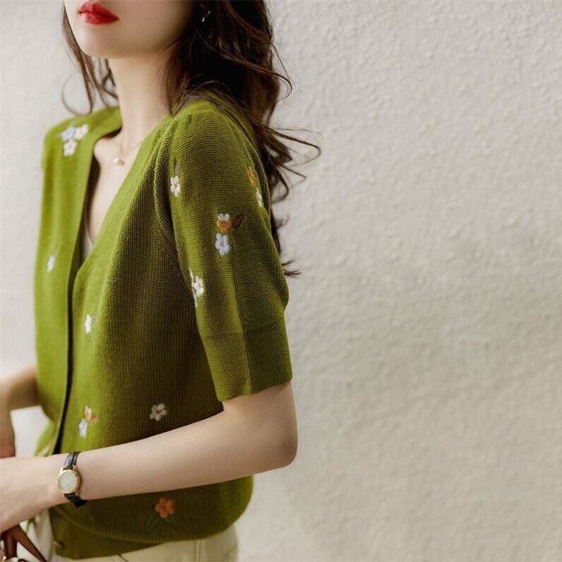 ノミクマ夏コントラスト刺繍半袖ニットカーディガン薄いシングルブレスト V ネックニットトップス ショート レッド ハーフスリーブ サマー 夏物 Vネック