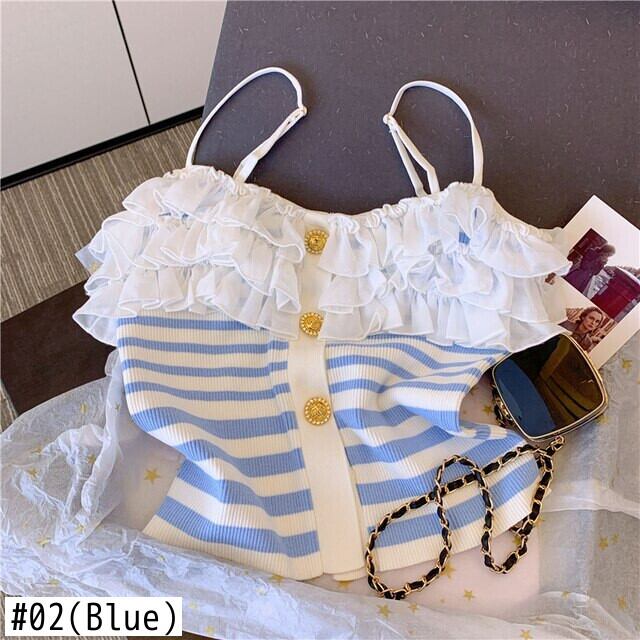 Nomikuma シックフリルパッチワークニットストライプスリングベスト夏服セクシースリムショートタンクトップ サマー 夏物