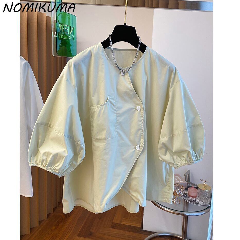 Nomikuma 不規則シングルブレスト O ネックパフスリーブブラウスシャツ夏 Chci 甘いデモーダ 大人ガーリー スウィート キュート カジュアル サマー 夏物 Oネック