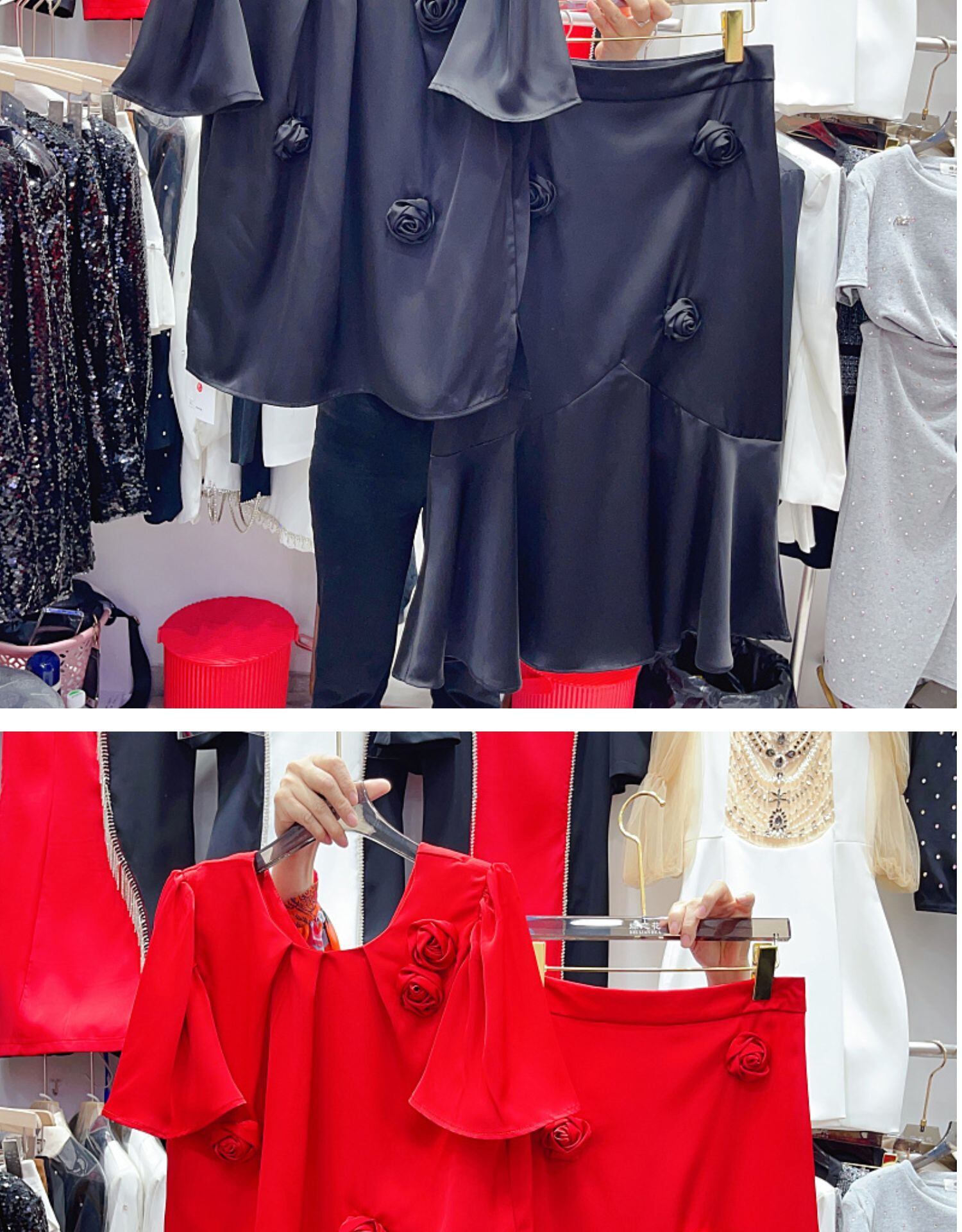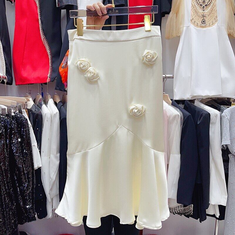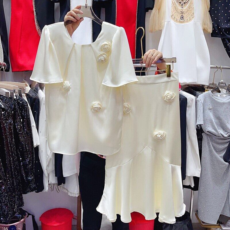 Nomikuma 夏 2 点セット O ネック フリル 3D フラワー トップス + ウエスト スカート衣装 サマー 夏物 Oネック フラワーデザイン