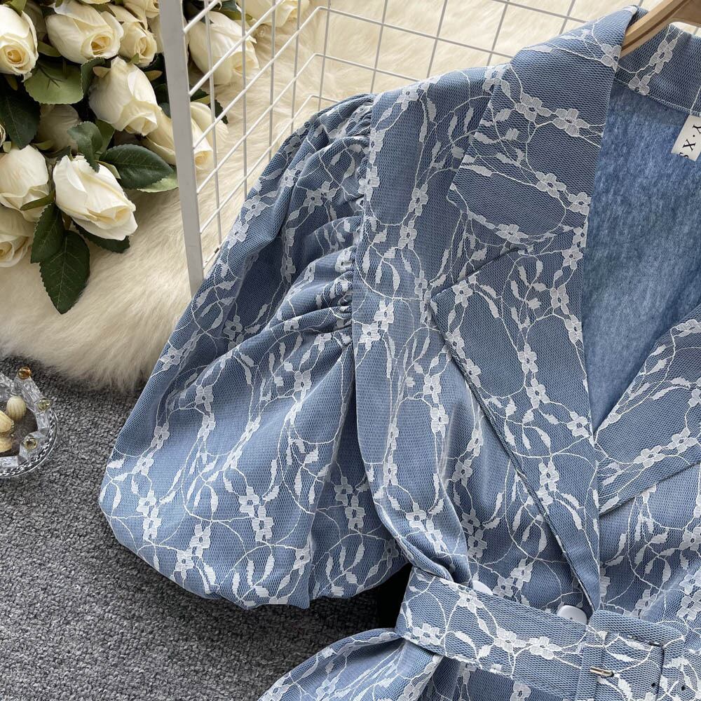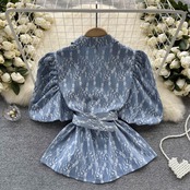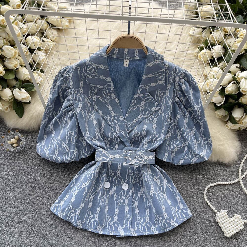 Nomikuma 印刷ブラウス夏ランタンスリーブノッチ襟シャツ夏ベルトスリムウエストトップス サマー 夏物 ハーネス
