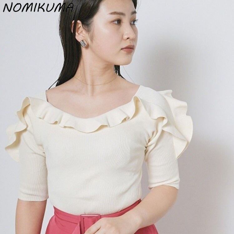 Nomikuma 春夏ストレッチスリムニット Tシャツトップスシックフリルパッチワーク半袖 O ネック服 Ropa デ ショート ハーフスリーブ スプリング 春物 サマー 夏物 Oネック