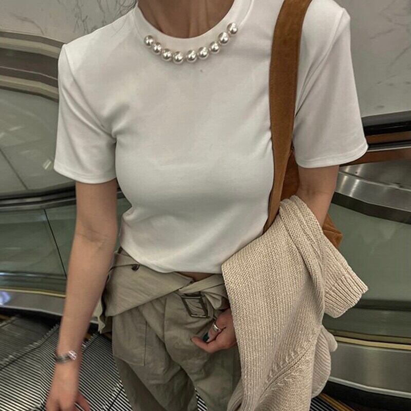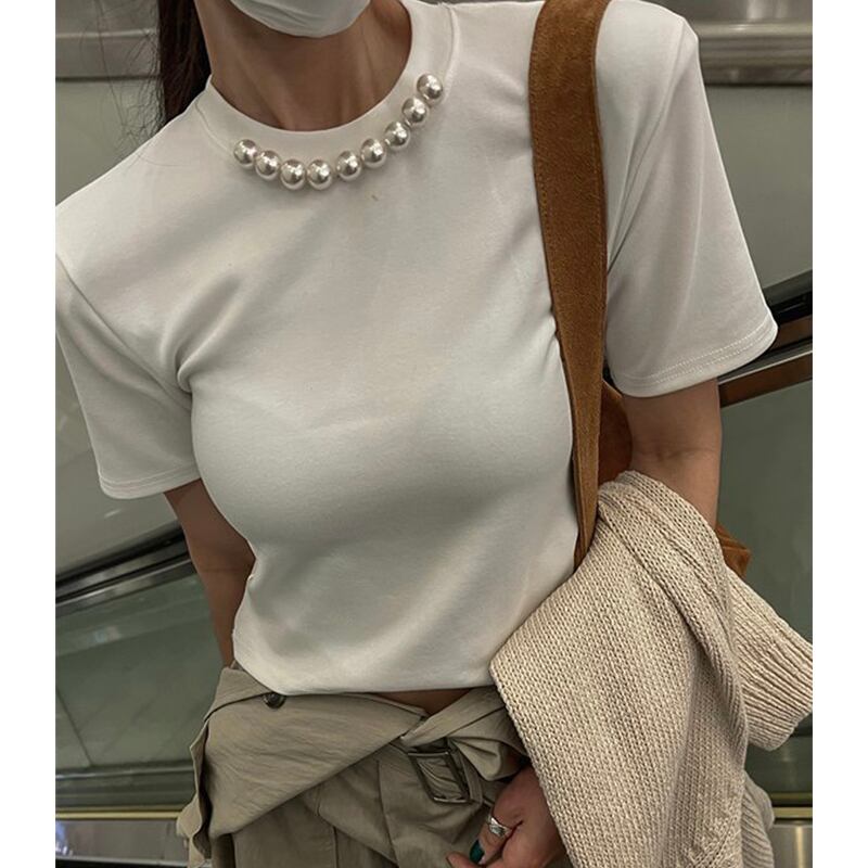 Nomikuma シック夏ビーズ O ネック Tシャツ Soldi スリム半袖グラフィック Tシャツ Tシャツトップス ショート ハーフスリーブ サマー 夏物 Oネック