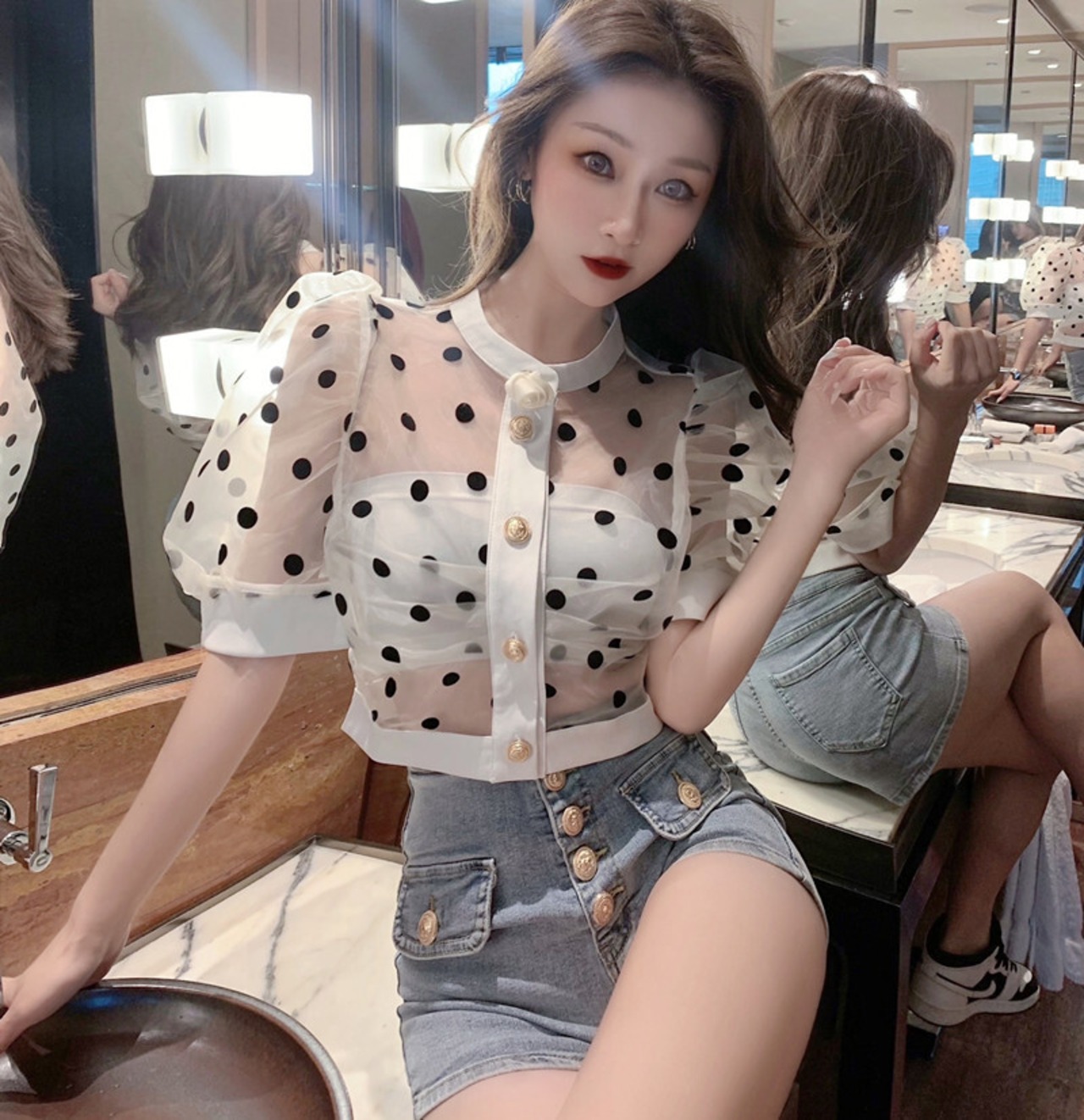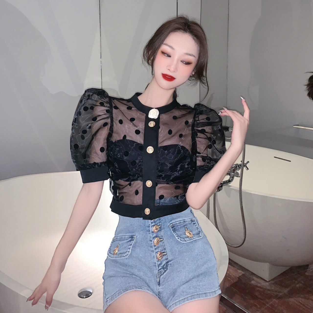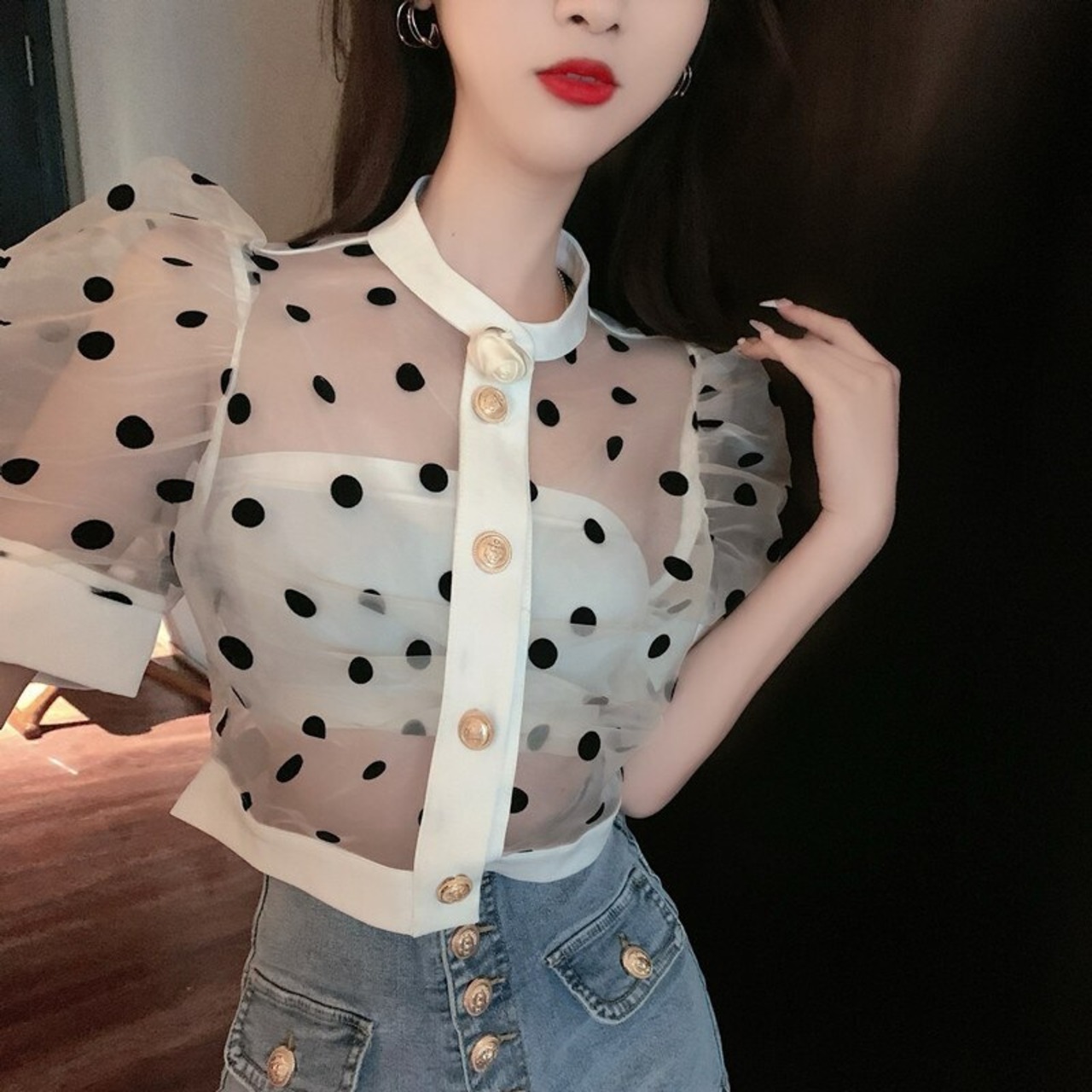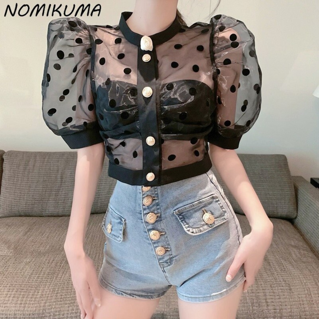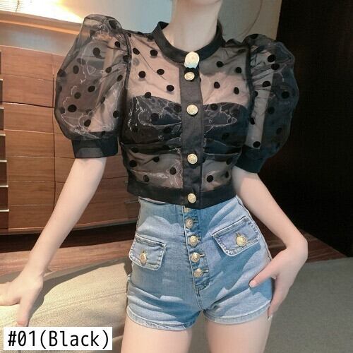 Nomikuma シックシースルードットブラウス夏太陽保護クロップトップパフスリーブブラウスデ サマー 夏物