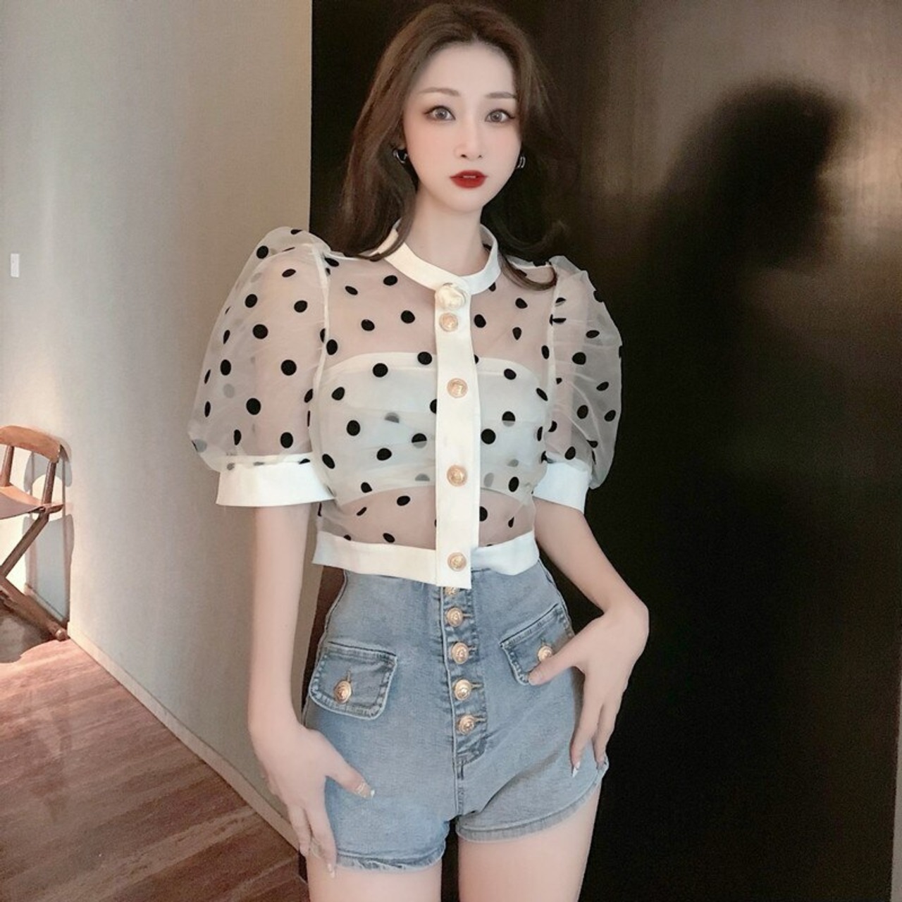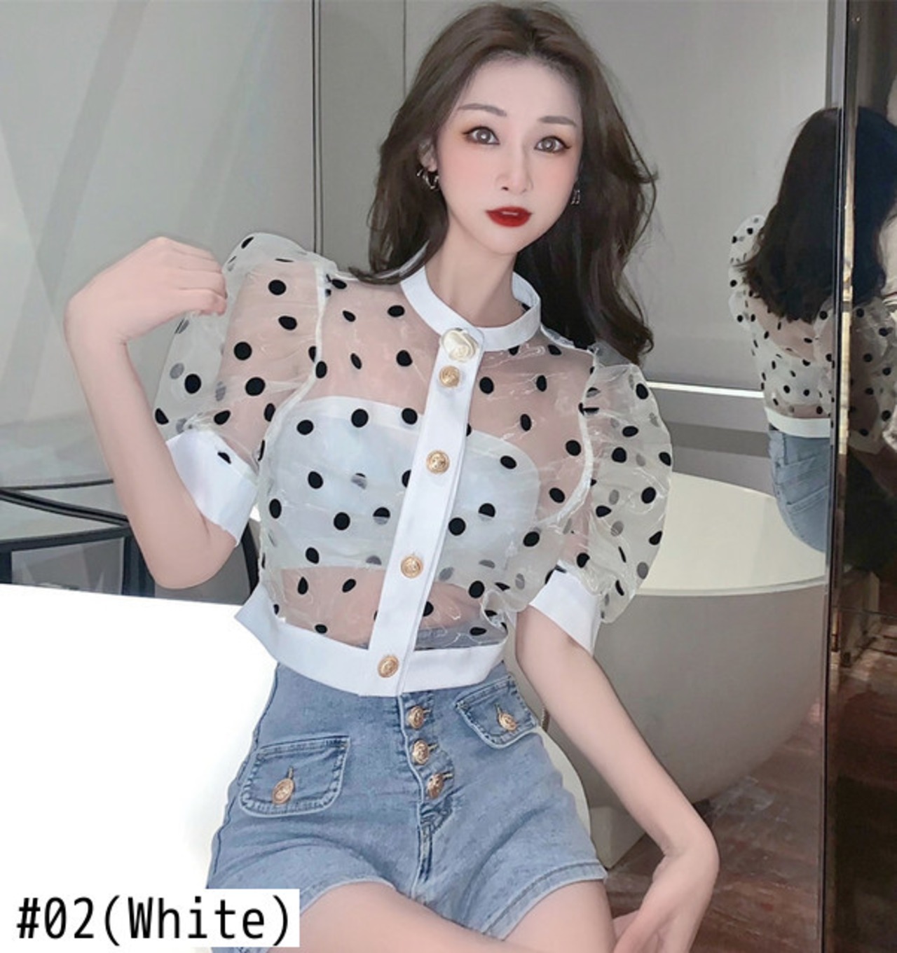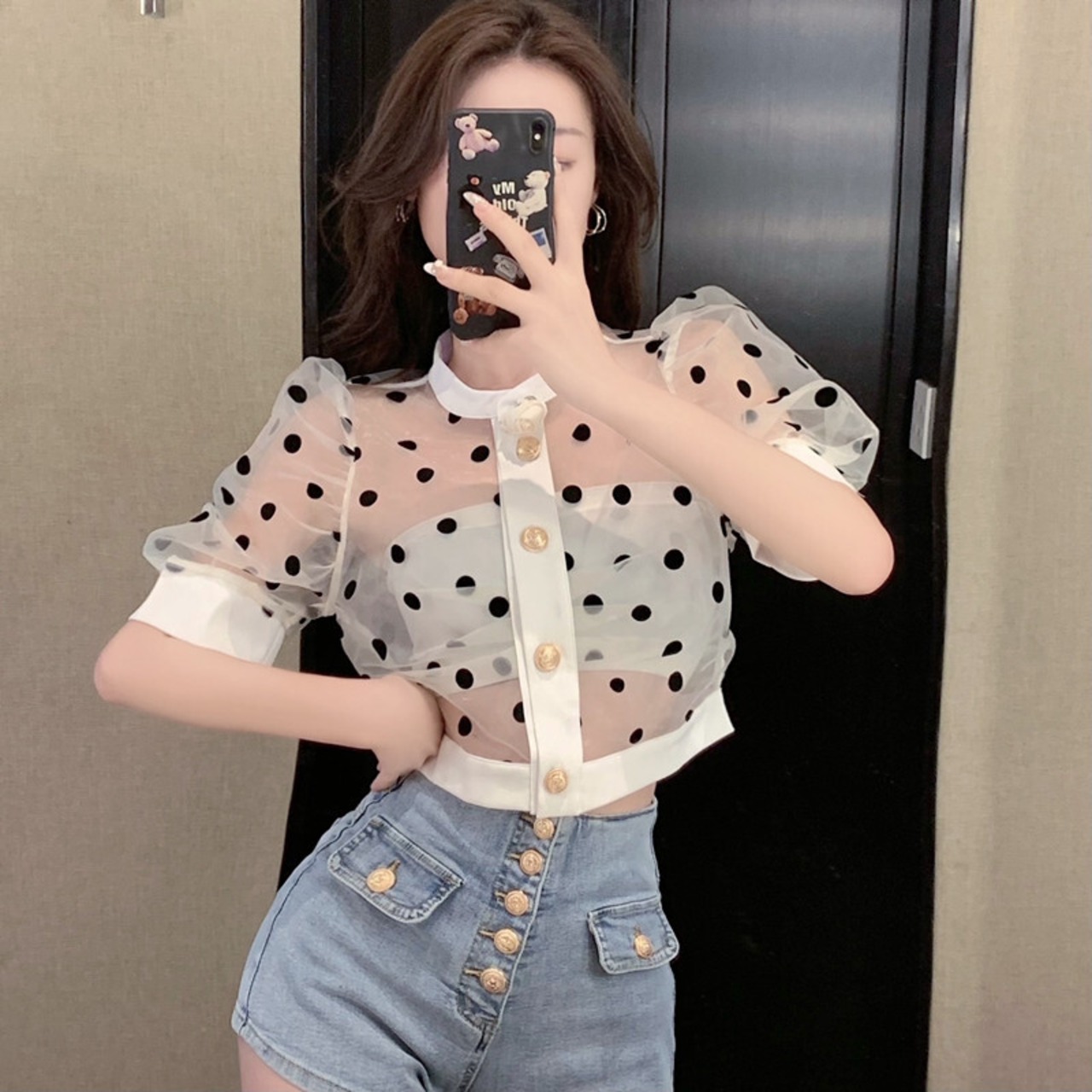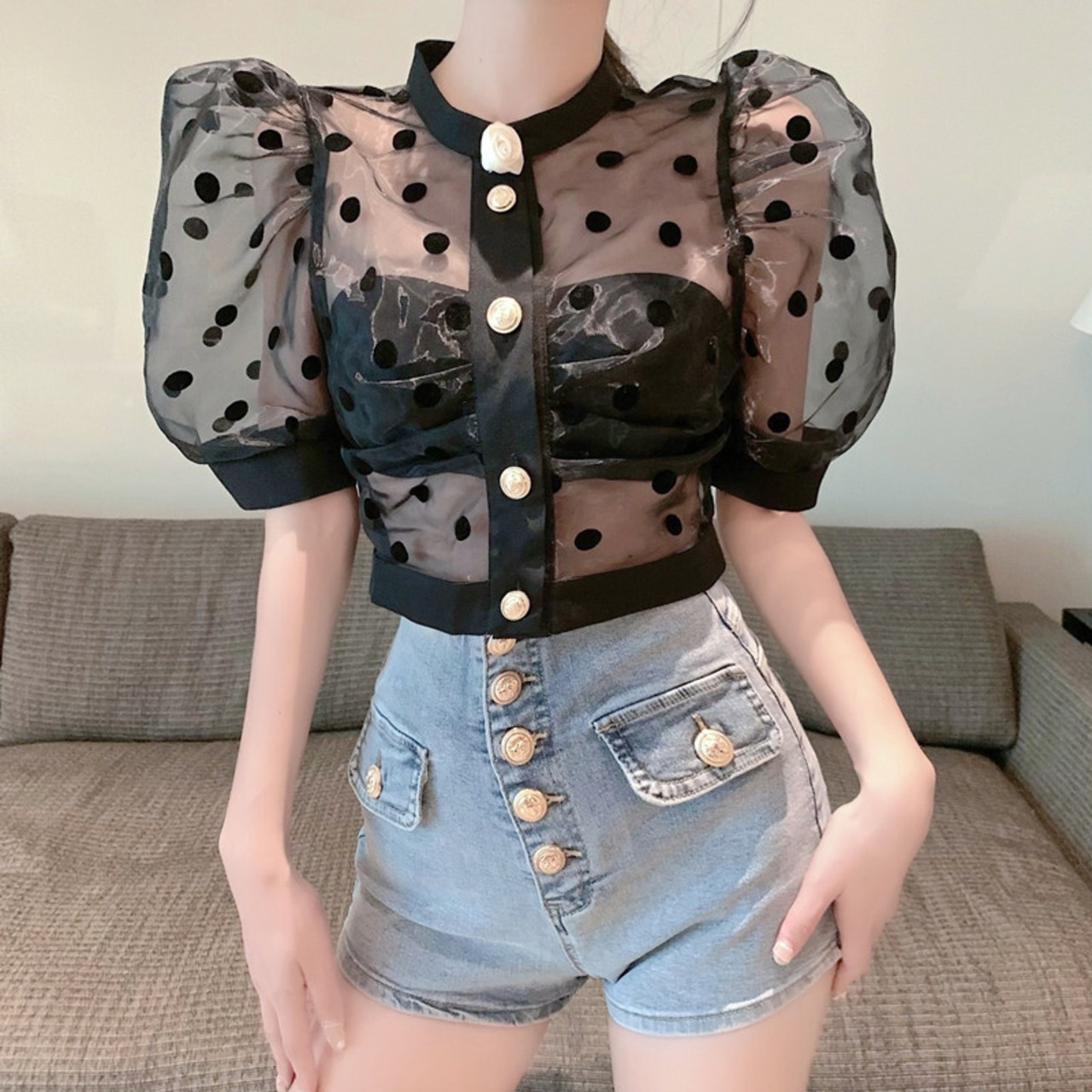 Nomikuma シックシースルードットブラウス夏太陽保護クロップトップパフスリーブブラウスデ サマー 夏物