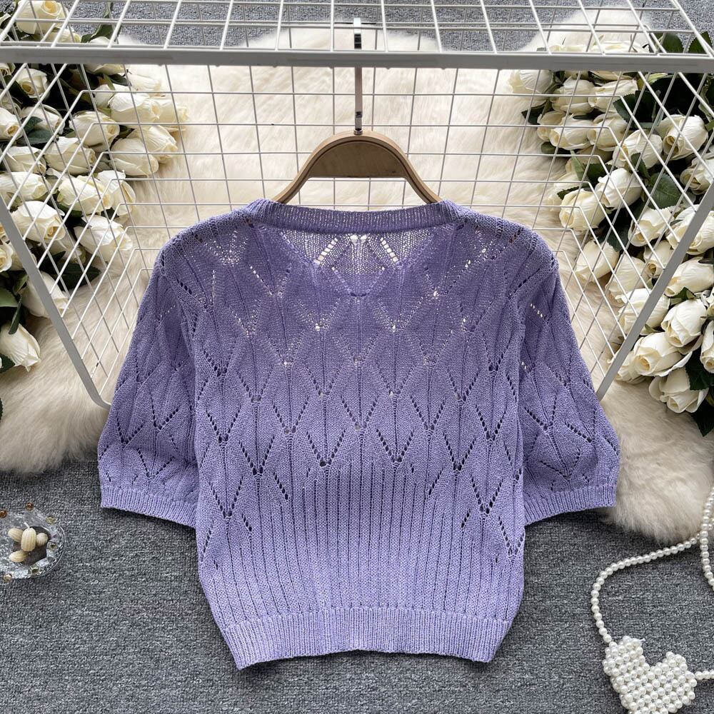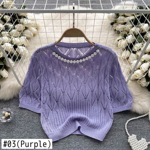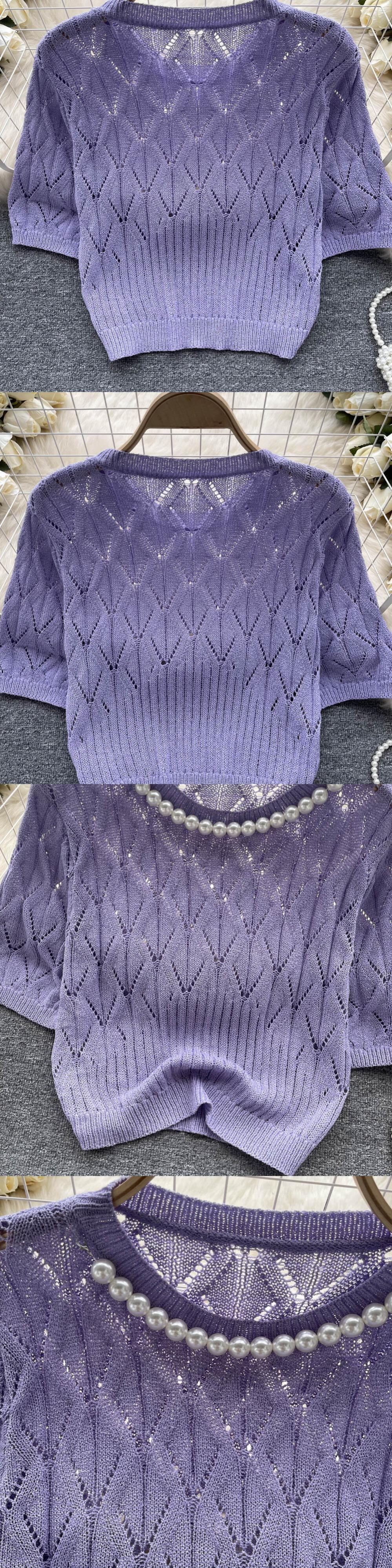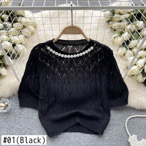 Nomikuma セクシー中空アウトニットトップス夏シックビーズ O ネック半袖 Tシャツ夏 Tシャツトップ ショート ハーフスリーブ サマー 夏物 Oネック