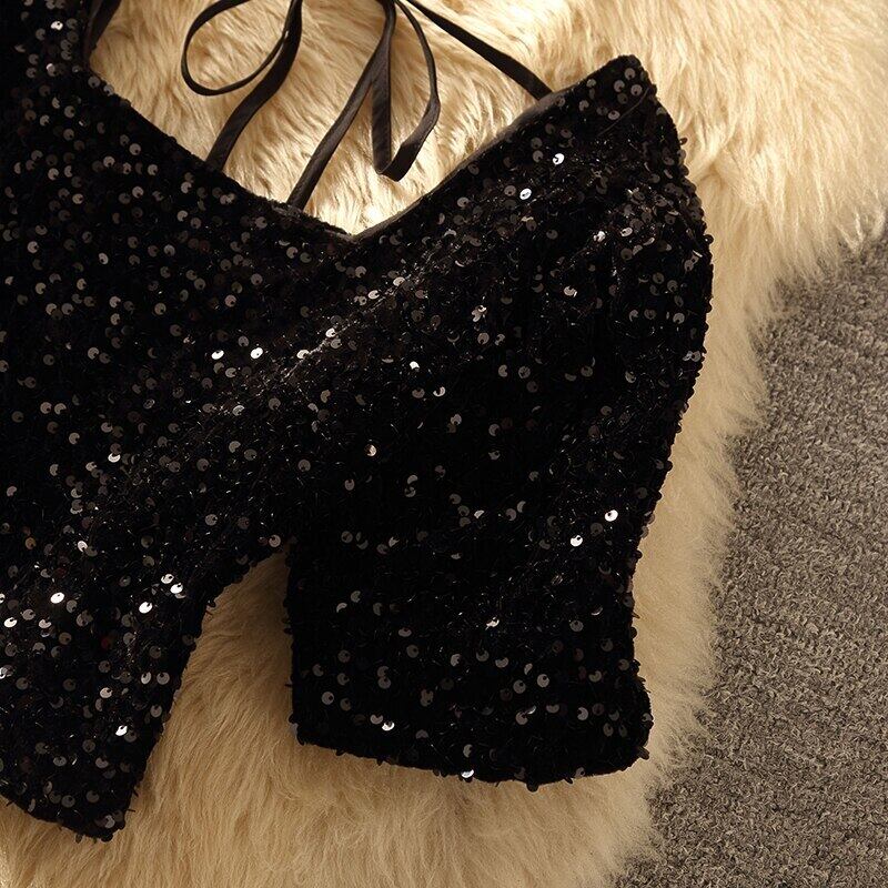 Nomikuma シックバック包帯クロップトップセクシースクエアネック Blingbling スパンコール半袖プルオーバー夏 Tシャツシャツ ショート ハーフスリーブ サマー 夏物 スクウェア