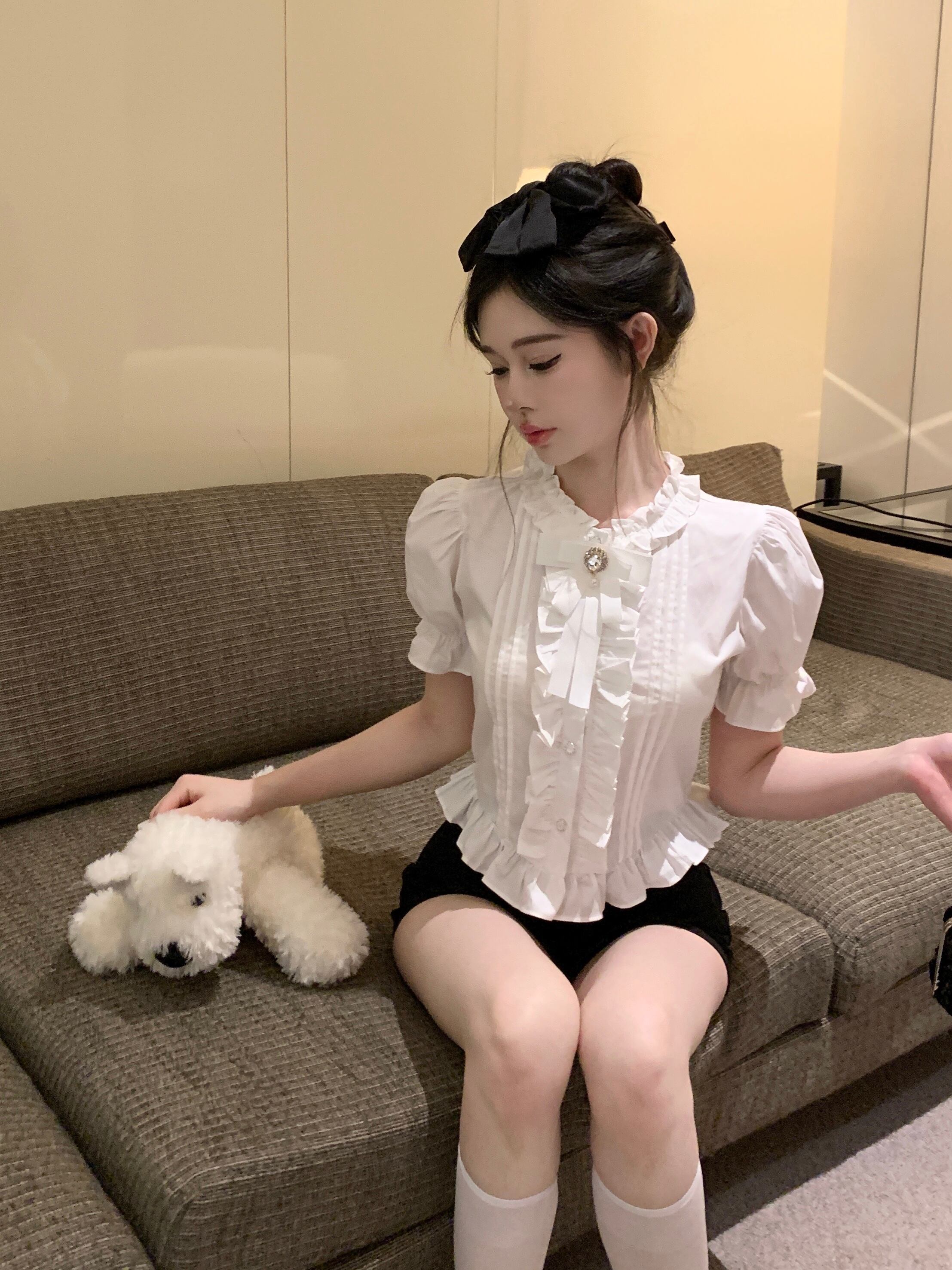 ノミクマ スイートプレッピースタイル パフスリーブ ブラウス サマーシック ちょう結び スリム ショートシャツ フリル パッチワーク デ リボン 大人ガーリー スウィート キュート カジュアル 夏物