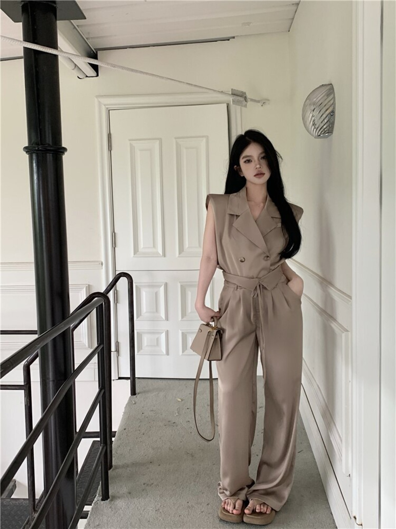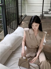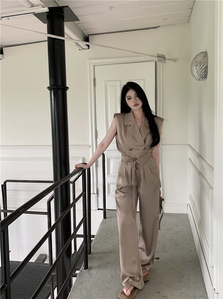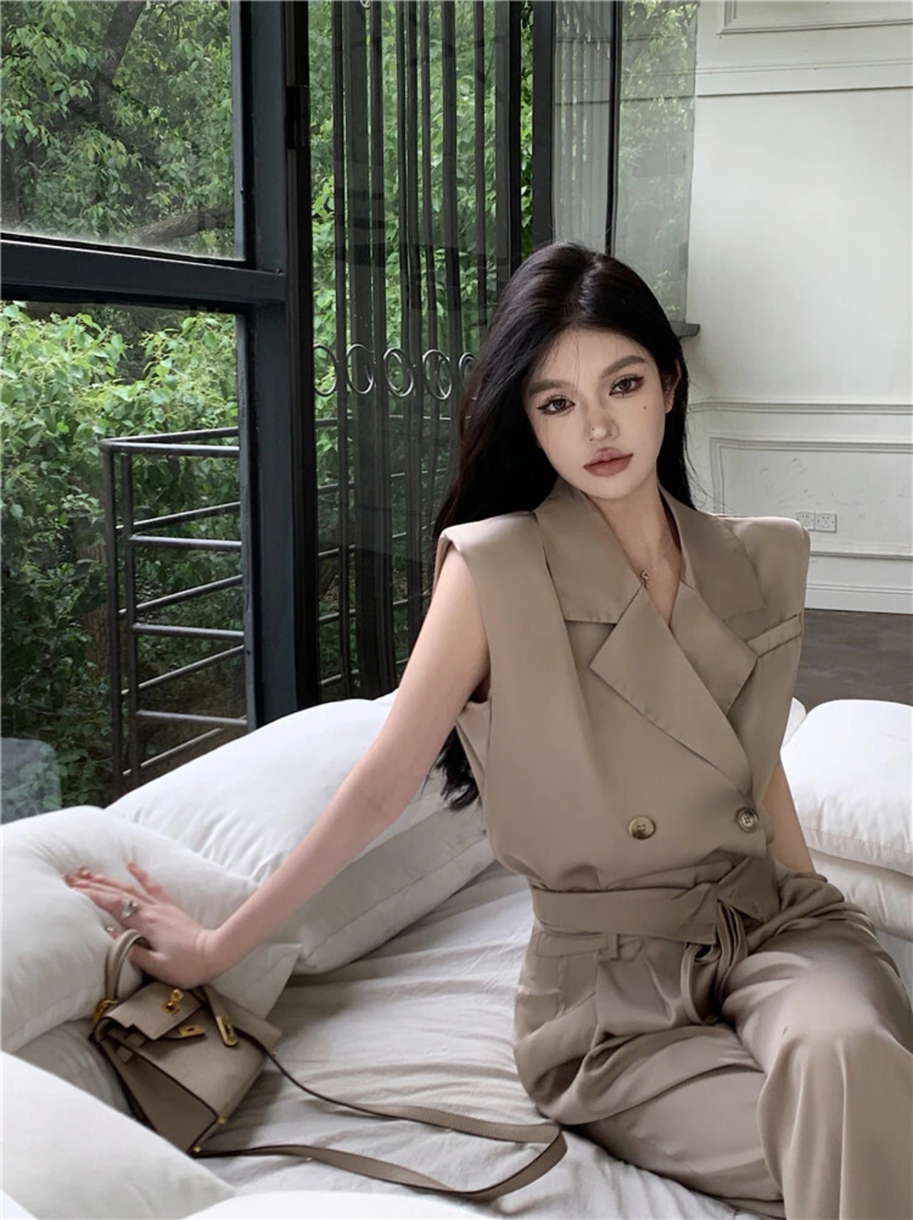 Nomikuma 因果スーツセット夏ノースリーブブレザートップ + レースアップウエストワイドレッグロングパンツ 2 ピース衣装 サマー 夏物 ワイドパンツ