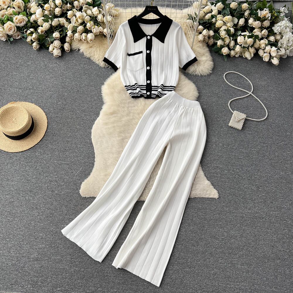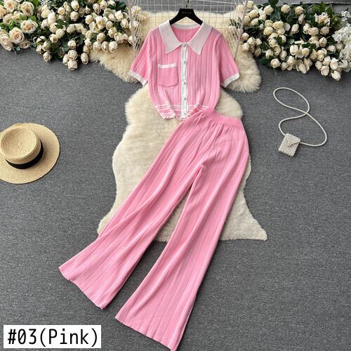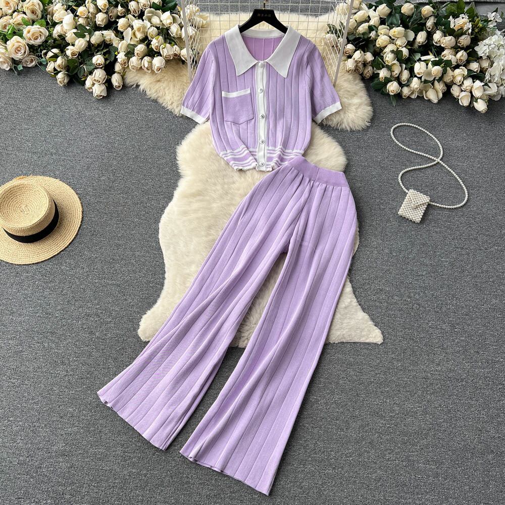 Nomikuma ニットセット女 ロング サマー 夏物 ストライプ ワイドレッグ ワイドパンツ