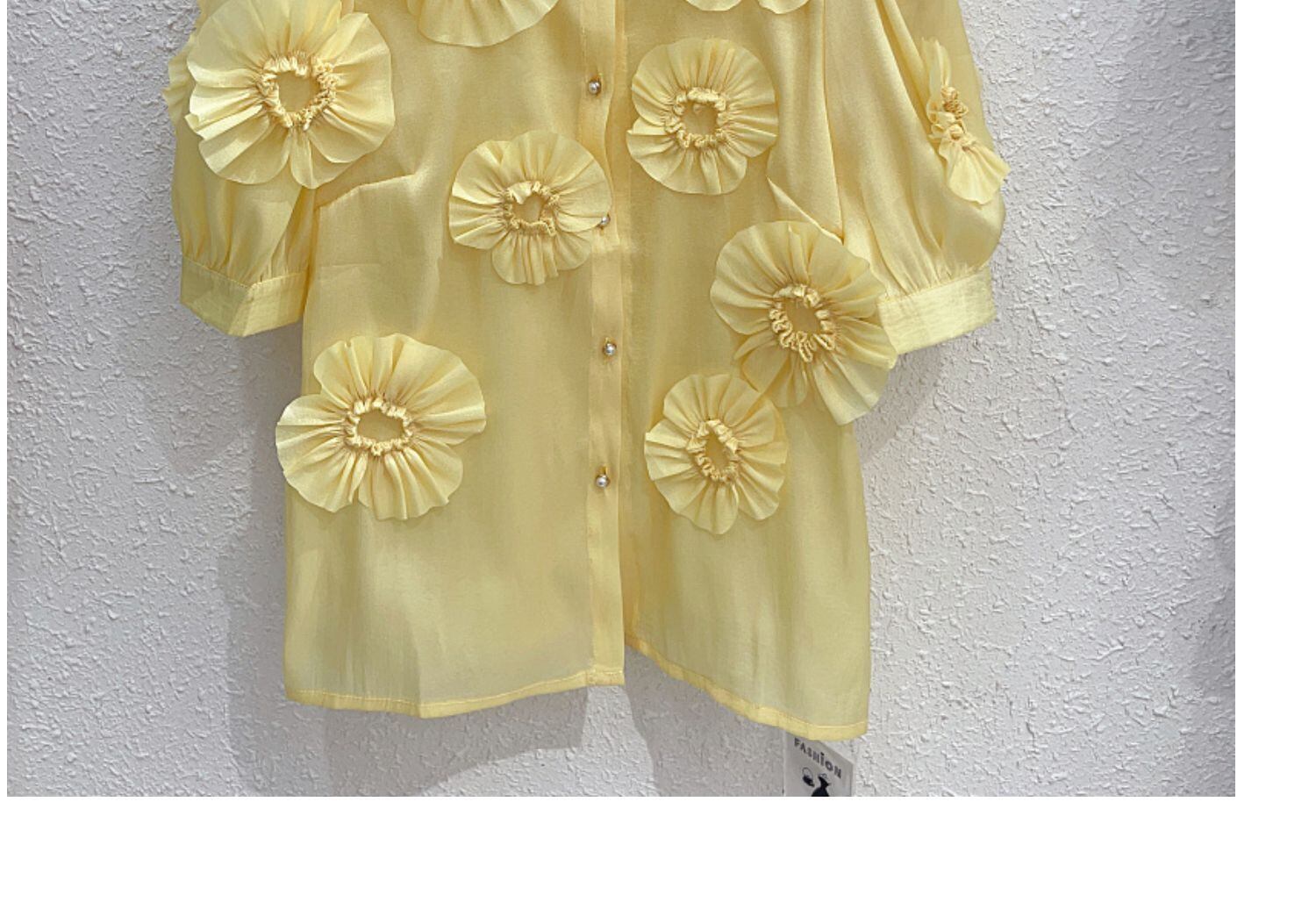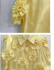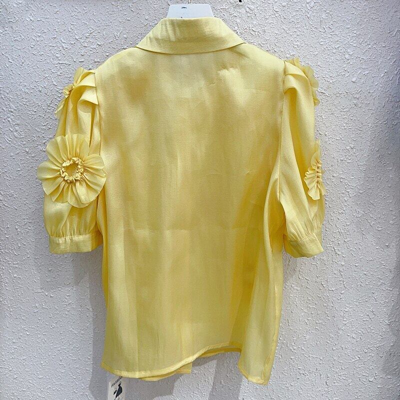 [ノミクマ] Sweet 3D Flowers Folds パフスリーブ ブラウス トップス ターンダウンカラー シースルーシャツ 大人ガーリー スウィート キュート カジュアル フラワーデザイン