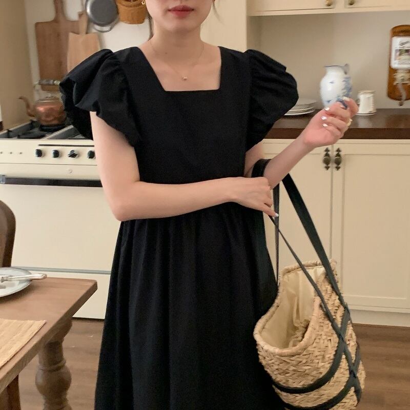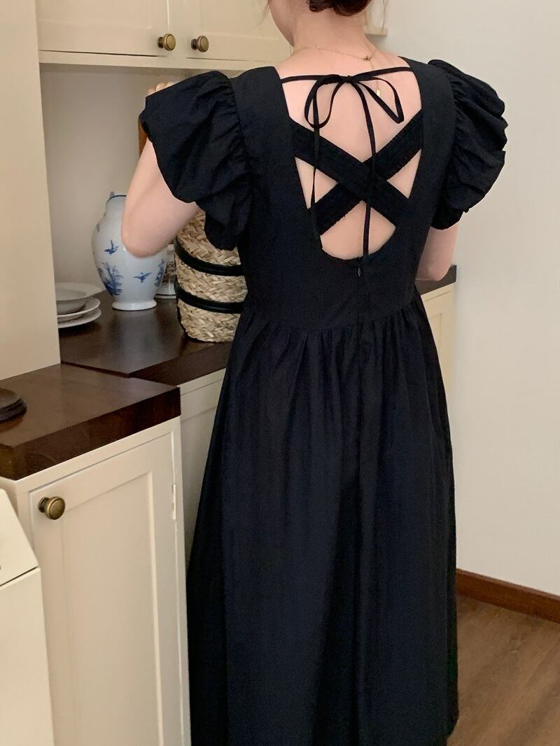 Nomikuma シックパフスリーブスクエアカラードレスセクシーバックレスレースアップクロスドレス Vestidos スクウェア