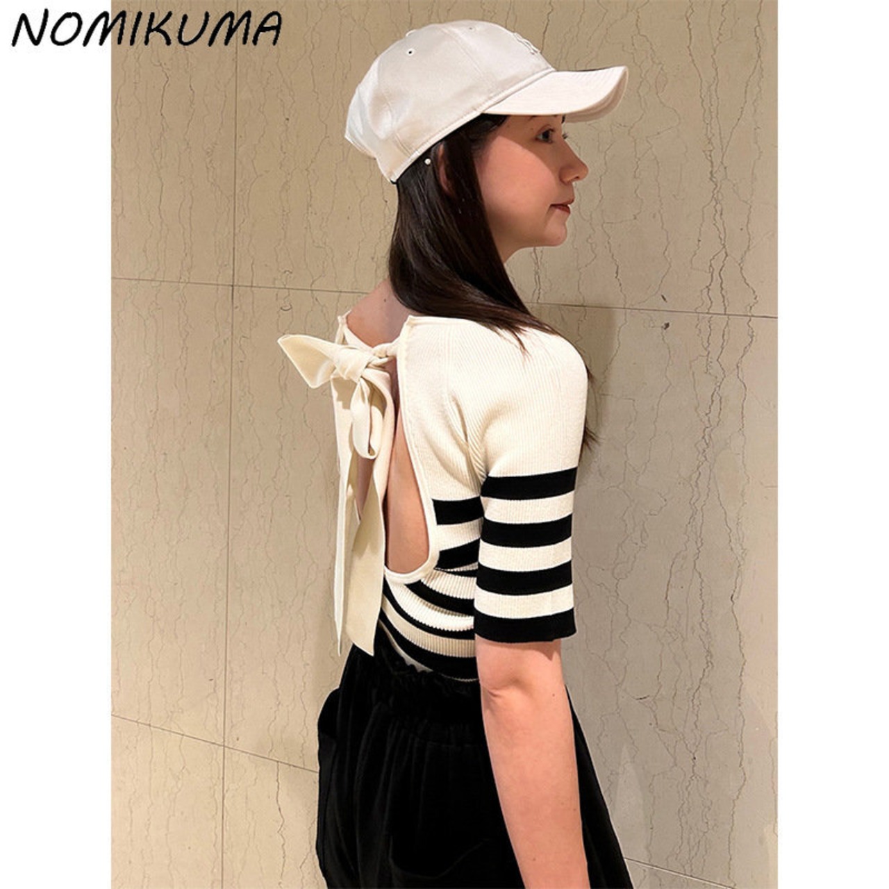 Nomikuma ストライプ スリム ニット ハーフスリーブ Tシャツ トップス スタイル セクシー リボン バンデージ バックレス シャツ レディース 夏 半袖 サマー 夏物
