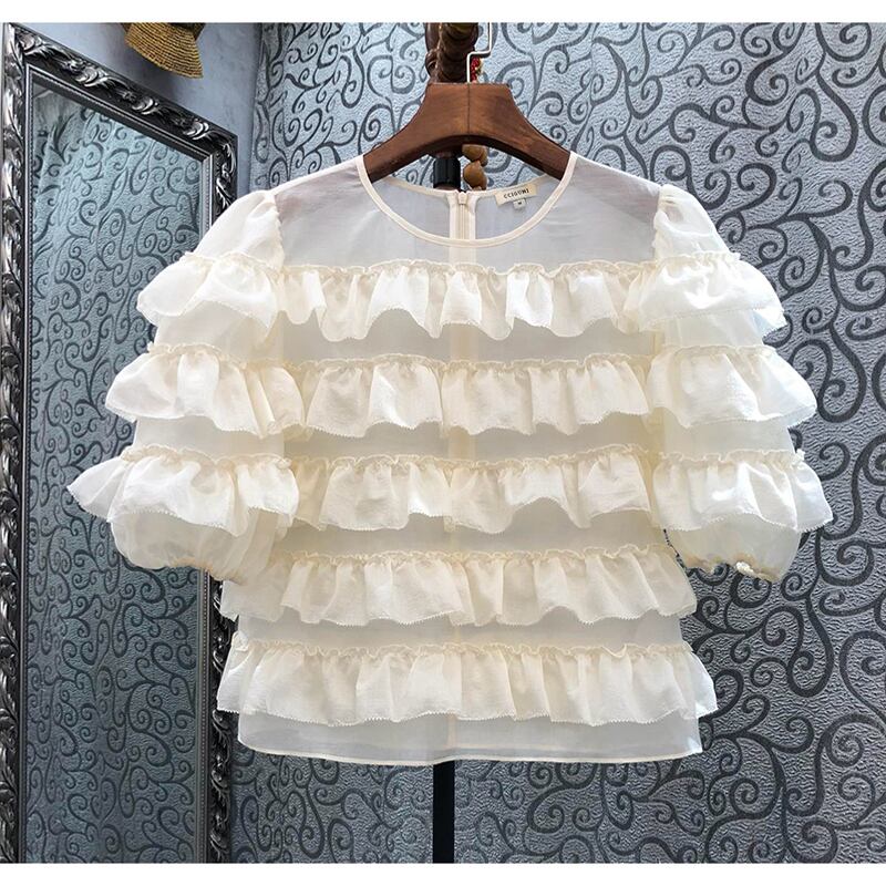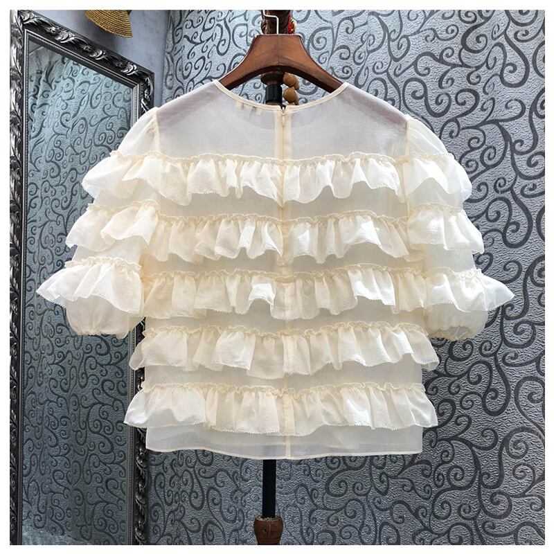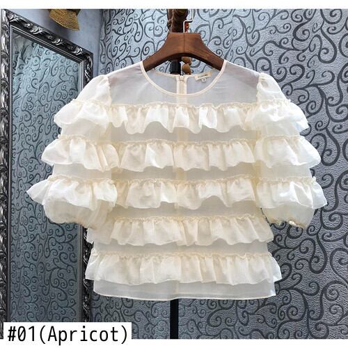Nomikuma シックレイヤードフリルパッチワークブラウストップス甘いパフ Slevee O ネックシャツ夏 大人ガーリー スウィート キュート カジュアル サマー 夏物 Oネック
