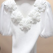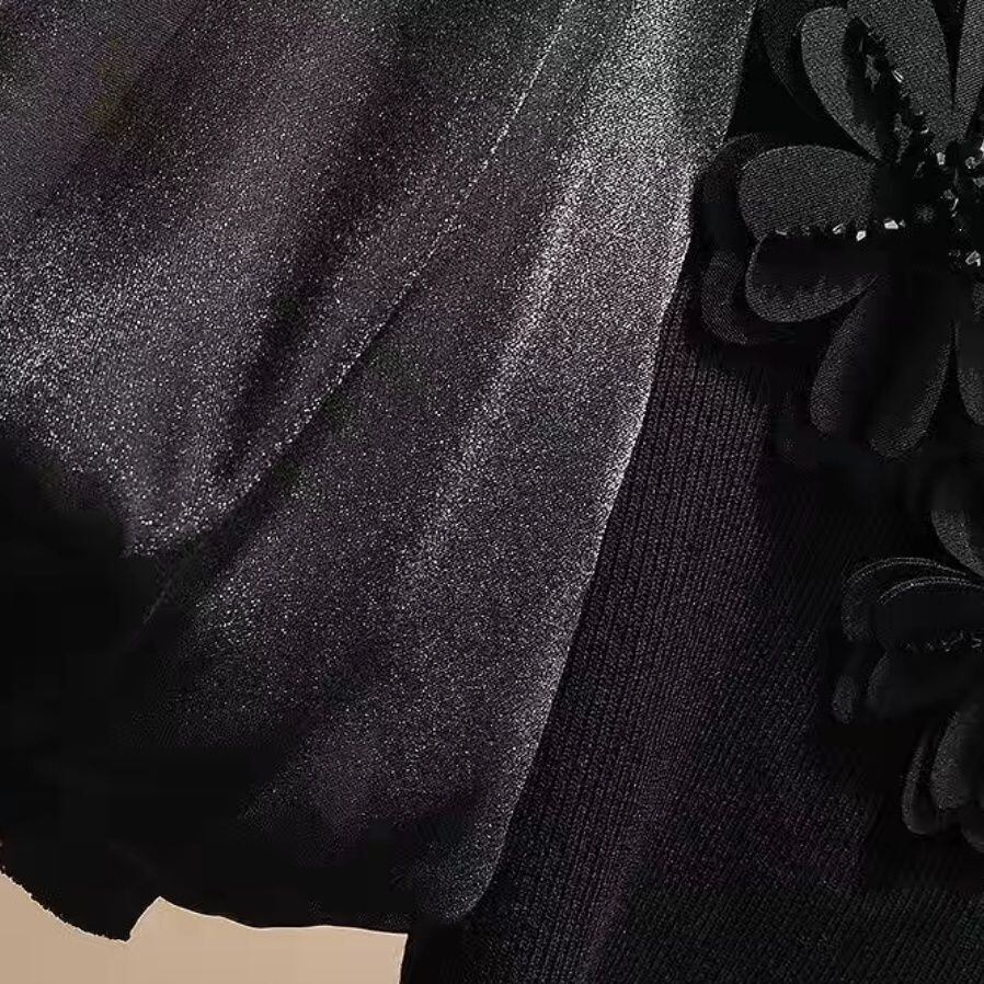 Nomikuma スウィートビーズ花ニットトップス夏スリムシャツ夏シフォンパフスリーブパッチワーク V ネック Tシャツ 大人ガーリー キュート カジュアル サマー 夏物 Vネック フラワーデザイン