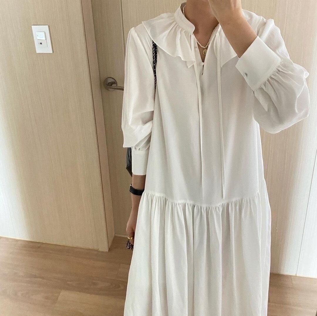 Nomikuma フリル レースアップ ハーフオープンカラードレス パッチワーク カジュアル Aライン Vestidos 長袖ドレス ロング