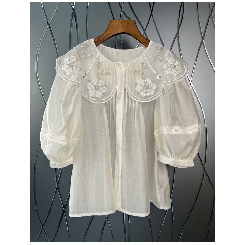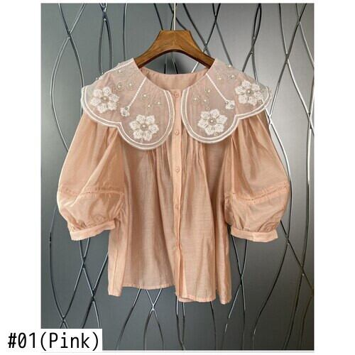 Nomikuma シックビーズダイヤモンドピーターパン襟パフスリーブブラウス夏シック甘いシャツ 大人ガーリー スウィート キュート カジュアル サマー 夏物