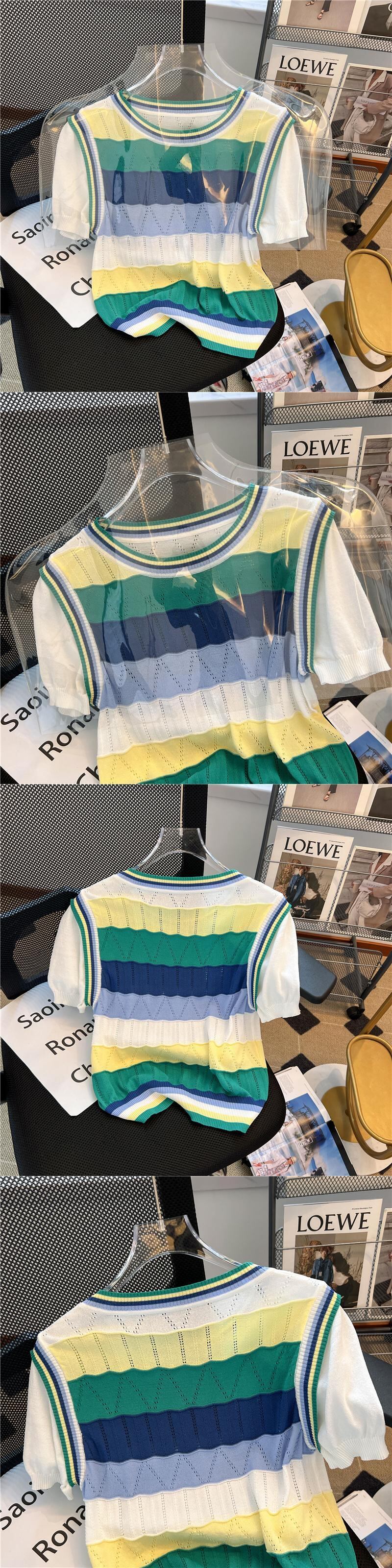 Nomikuma 夏ヒットカラーストライププルオーバー中空アウトパフスリーブニット Tシャツトップスシック甘いグラフィック Tシャツ 大人ガーリー スウィート キュート カジュアル サマー 夏物