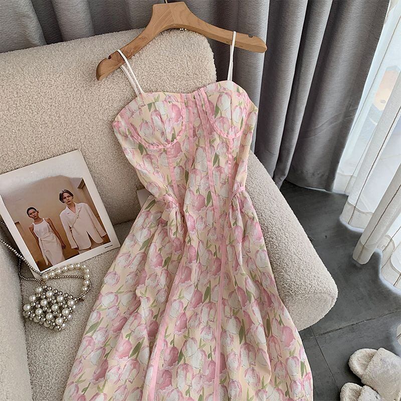 Nomikuma セクシースリムウエスト因果 A ラインスパゲッティストラップドレス夏甘い印刷スリング Vestidos 大人ガーリー スウィート キュート カジュアル サマー 夏物 Aライン