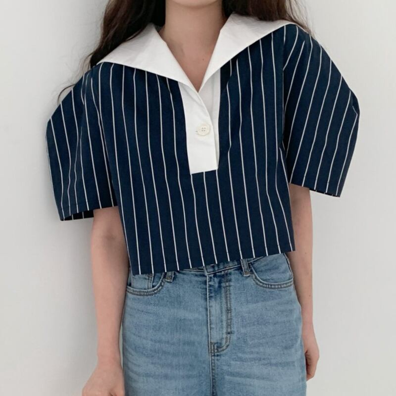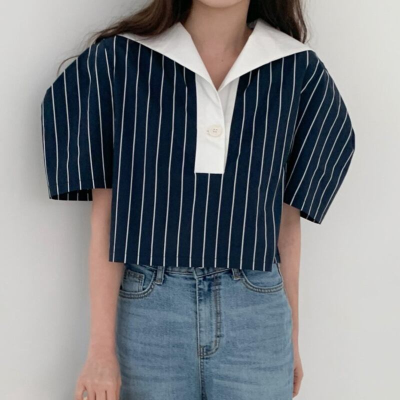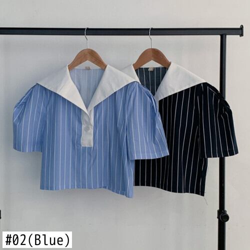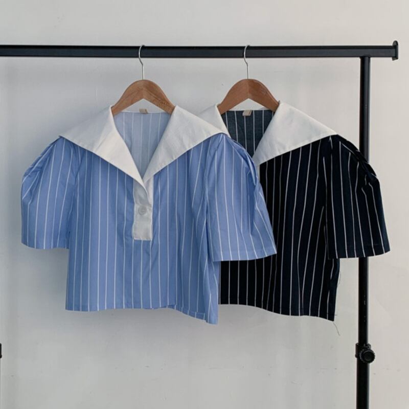 ノミクマシックサマーレトロコントラストネイビーカラーストライプパフスリーブシャツトップレディースブラウス 夏物