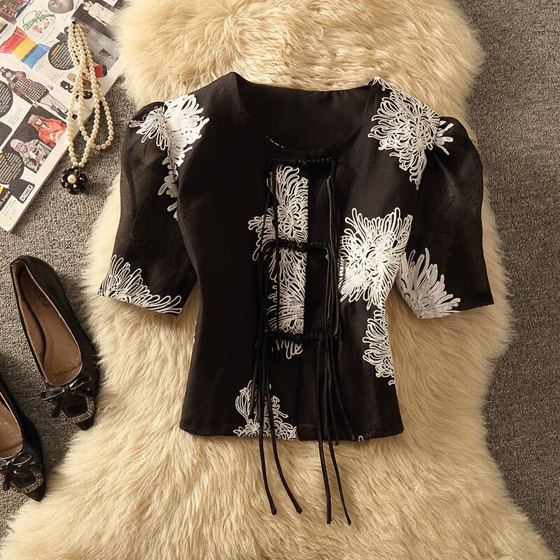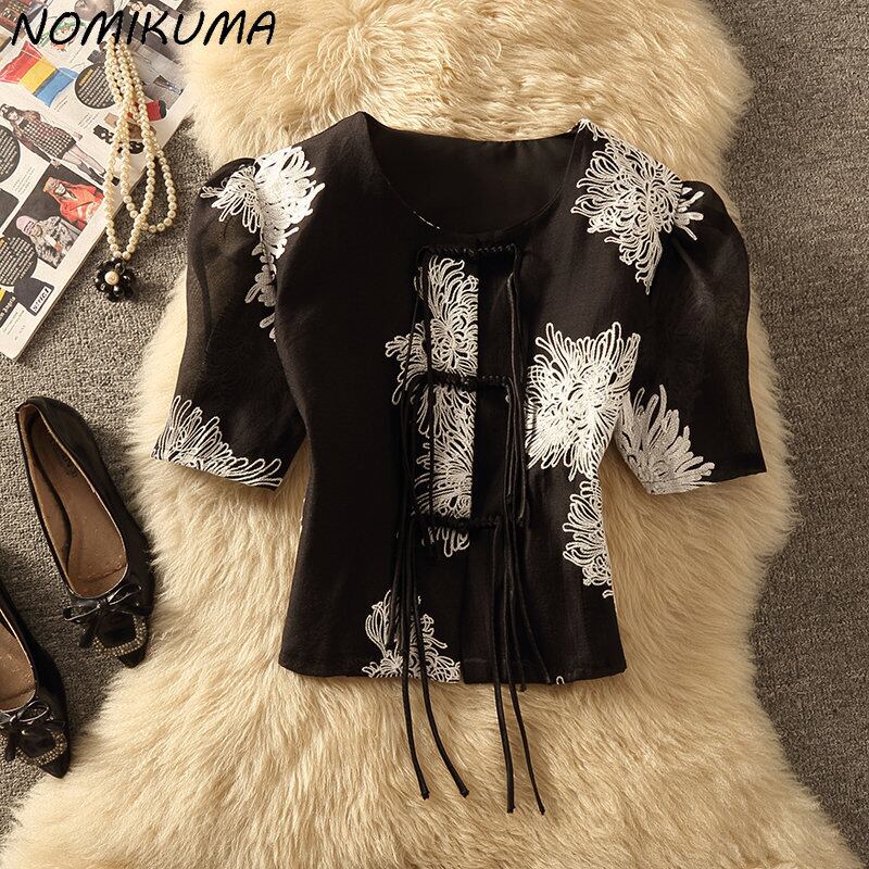 Nomikuma 花刺繍ショートブラウス トップス パフ スリーブ O ネック夏シャツ サマー 夏物 Oネック フラワーデザイン