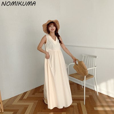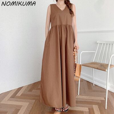ノミクマ サマー カジュアル ノースリーブ Vネック タンクワンピース ウエストゴム カジュアル Aライン ミドル丈ワンピース 夏物 ドレス