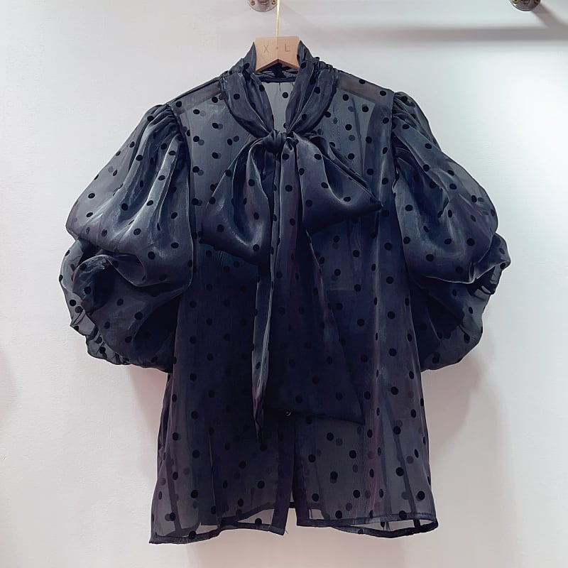 Nomikuma サマー ドット レディース トップ ボウ バンデージ V ネック パフ スリーブ ブラウス スウィート シック シャツ リボン 大人ガーリー キュート カジュアル 夏物 Vネック