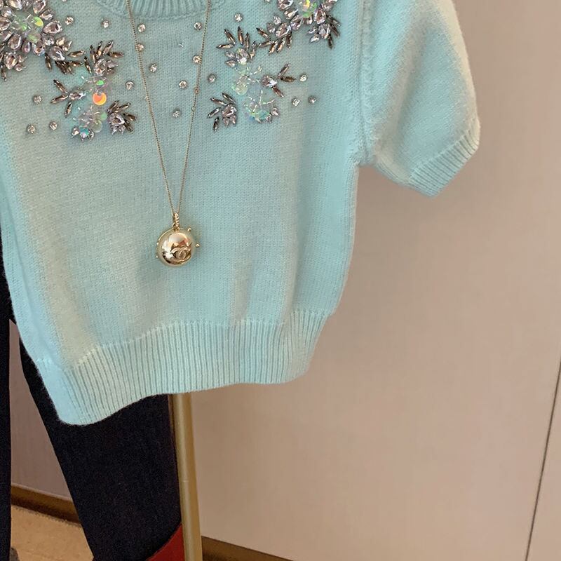 Nomikuma ダイヤモンド O ネック半袖ニット Tシャツ夏トップス因果甘い Tシャツ ショート ハーフスリーブ 大人ガーリー スウィート キュート カジュアル サマー 夏物 Oネック